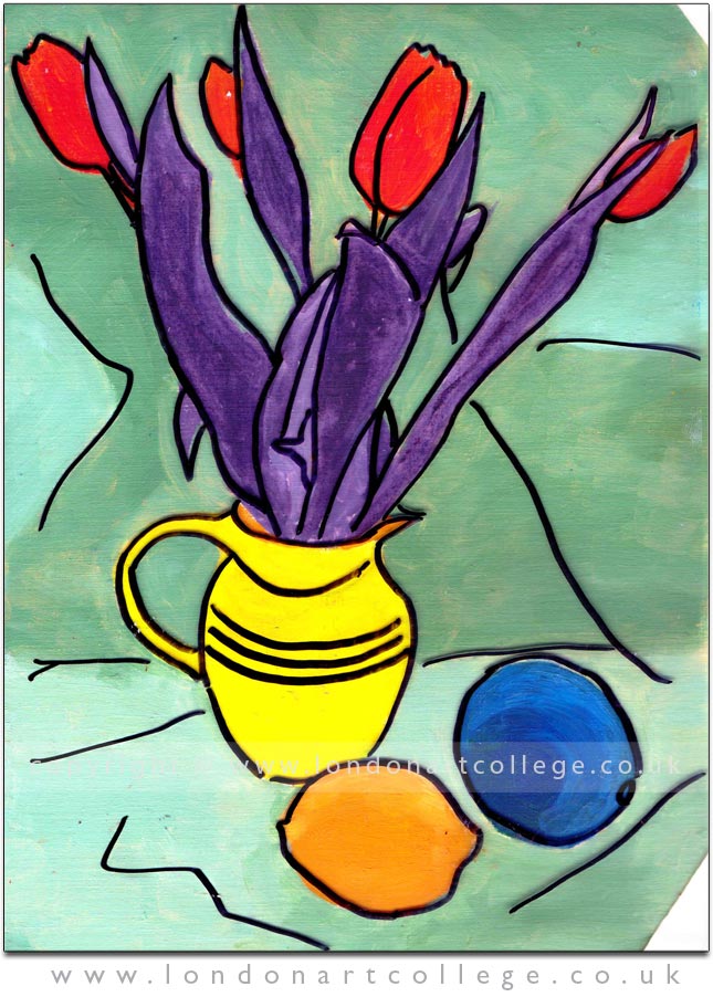 Elisabeth Planella is studying with Alan Dedman on the Oil Painting course and we were immediately drawn to this piece due to the amazing bold colours and composition. We love the black outlines to the objects, it almost gives it a stained glass appearance. Stunning!!