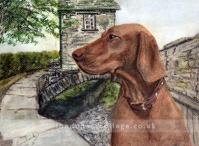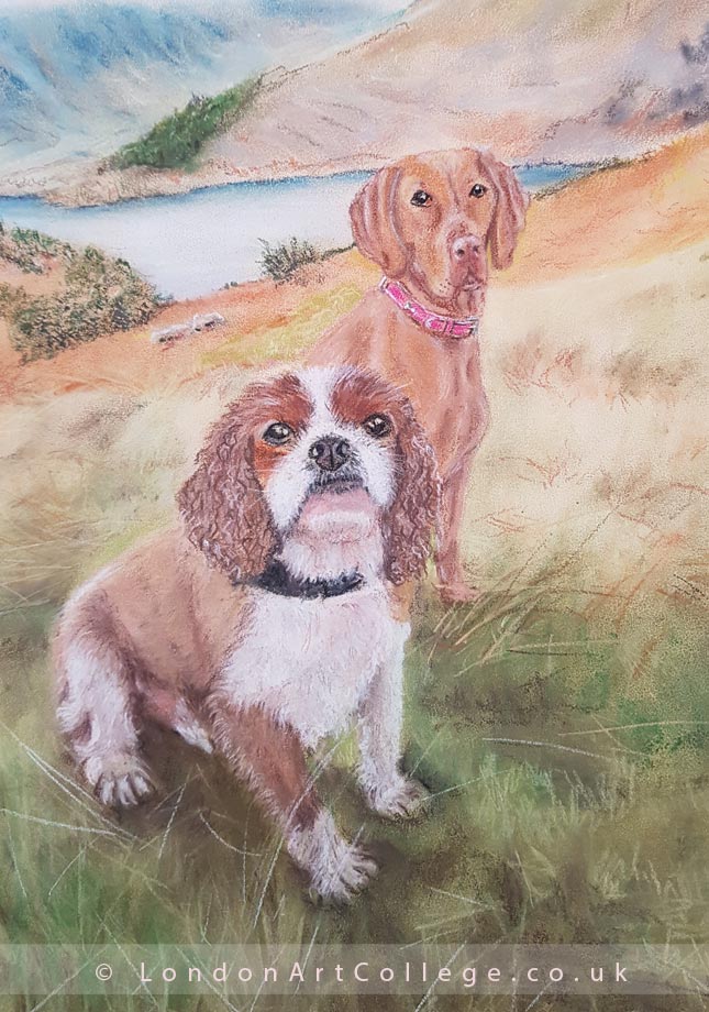 Do you want to paint dogs like Fiona? Would you like to learn how to create dog portraits with ease, perhaps place two dogs with in a scene from separate photos like Fiona has done below? Perhaps in addition you are interested in learning more about the business side of pet portraits? In addition you might be looking at starting up yourself and need to gain experience from a professional. If so our course will be perfect for you. Why not pop over to our website and read some of our Pet Portraits Testimonials and happy students. In conclusion why not visit the London Art College Online Art Courses and enroll today – and start your course tomorrow!