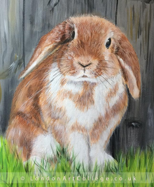 Fiona studied her online art course from the comfort of her own home with the London Art College. Her tutor was professional artist and art tutor Gayle Mason. As a result of all of Fiona’s hard work, she submitted her final painting below along with two other wonderful pieces which we have included too. The painting of the rabbit was created in acrylic paints and this is what Fiona said…