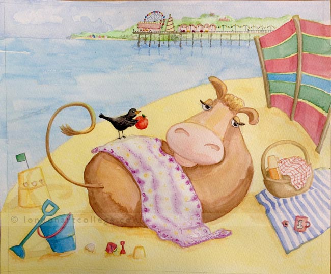 My name is Rachel Duffield and I am studying the Children’s Illustration Books Online Art Course with tutor Maggy Roberts. The brief for this picture asked for an illustration that showed a friendship between a cow and a bird. The picture was also required to show how the friends had enjoyed travels and adventures together.