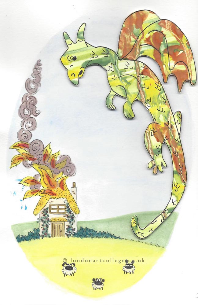 Pauline Manderville has created a wonderful illustration for her Fiery Fred assignment on the Illustrating Children’s Books Diploma Course. We love the way Pauline has given the dragon a very 3 dimensional effect by painting him separately with a marbled effect and outlined in black ink. This really makes the dragon stand off of the illustration. We hope you like it as much as we do!