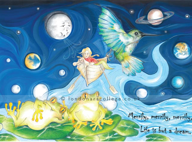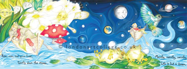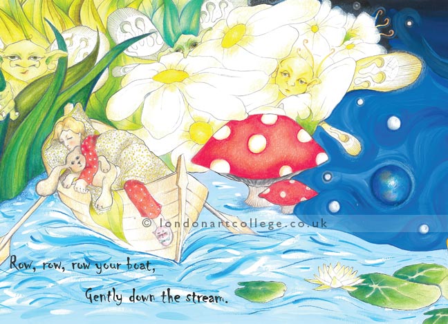 Karen Moore has created a very dreamy illustration for the ‘Row, Row Row Your Boat’ exercise. If you look at the detailed versions below you will be able to see the characters Karen has created more clearly. The whole concept is wonderful and very clever. We hope you like it as much as we do!