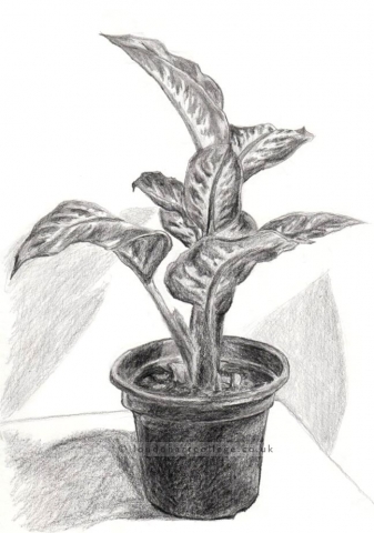 New student Roseana Mayumi has created a lovely drawing of her pot plant and has noted the shadows from the leaves on the surrounding walls and surfaces well. Superb work!