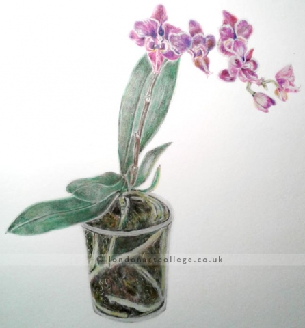 Pauline has created a painting of her stunning orchid. We can see that a lot of work has gone into creating this painting and very delicately done too. Even down to the see through tub with the roots inside. Well done Pauline!