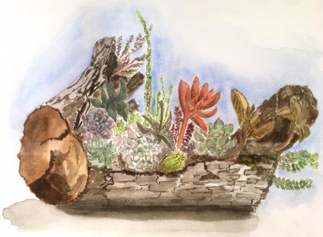 “The plant I have on my windowsill is not growing in a pot, but is a cactus garden grown in a log. I planted this up about a year ago at a workshop, and am delighted that it is still surviving and growing.”