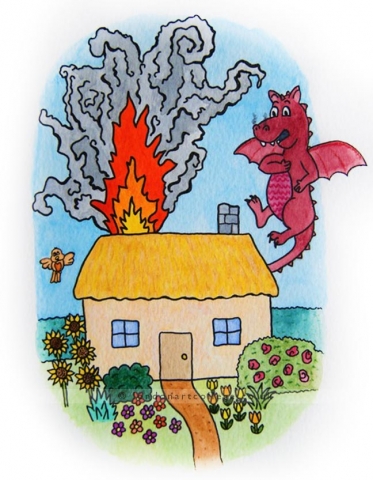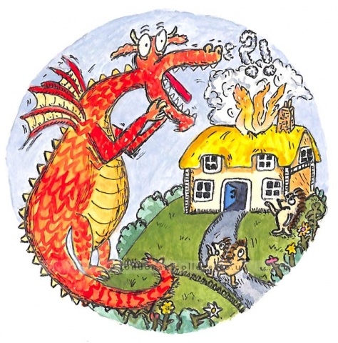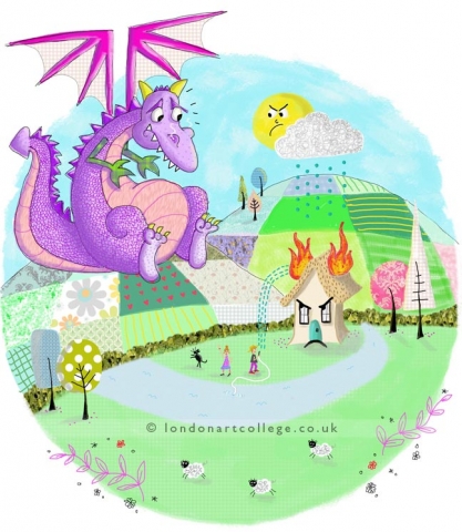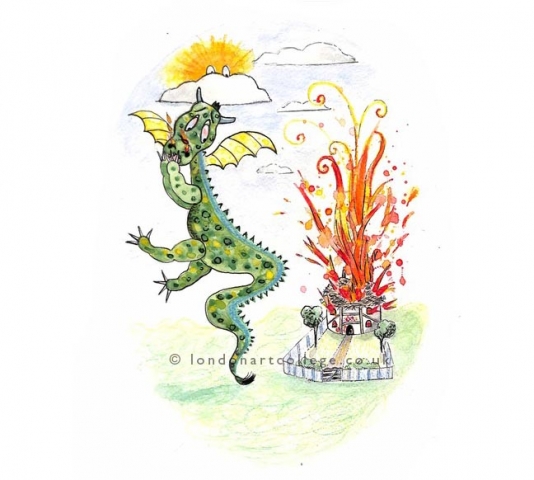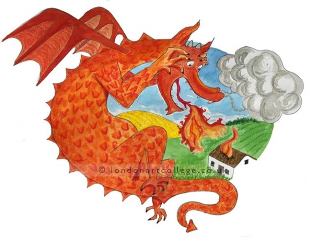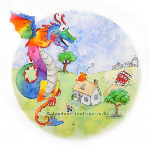We have lots of lovely illustrations today from our students on the Illustrating Children’s Books Diploma Course. This assignment is to create an illustration of a young dragon who accidentally sets a cottage on fire. We love that fact that all of the illustrations are so different, yet on the same theme. We hope you find them inspiring. The students work are as follows. Sarah Buckingham, Hannah Hiles, Jo Matthews, Lucy Manship, Katherine Langford, Mia Jenkins, Penny Winter.
