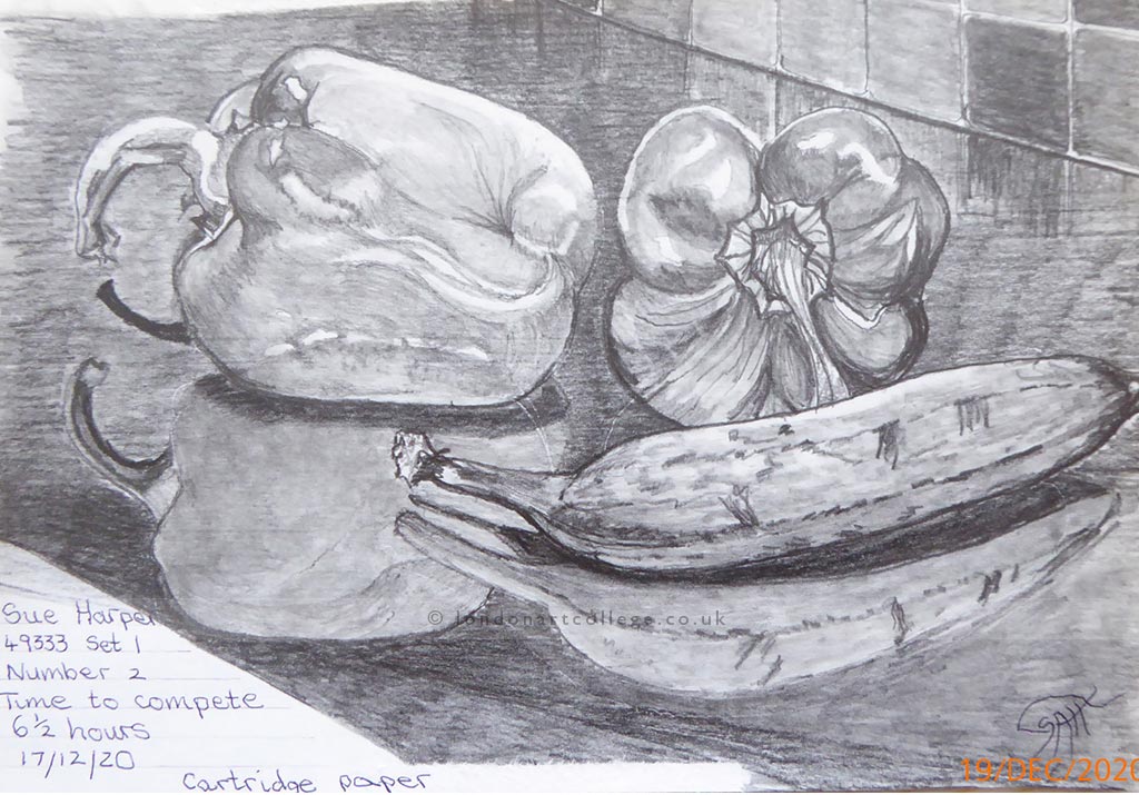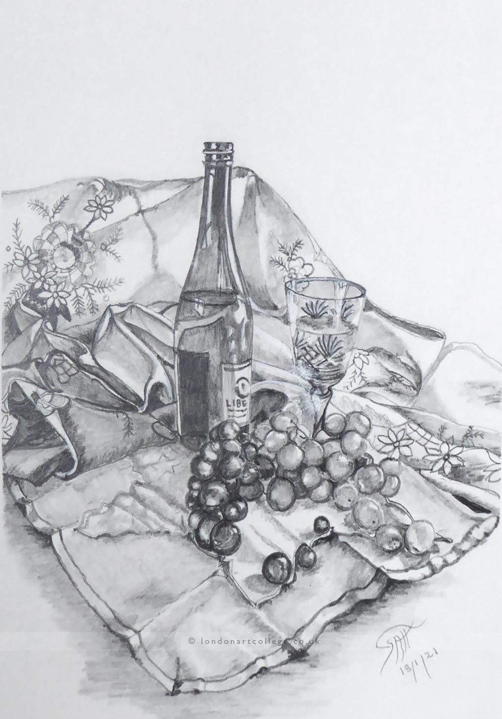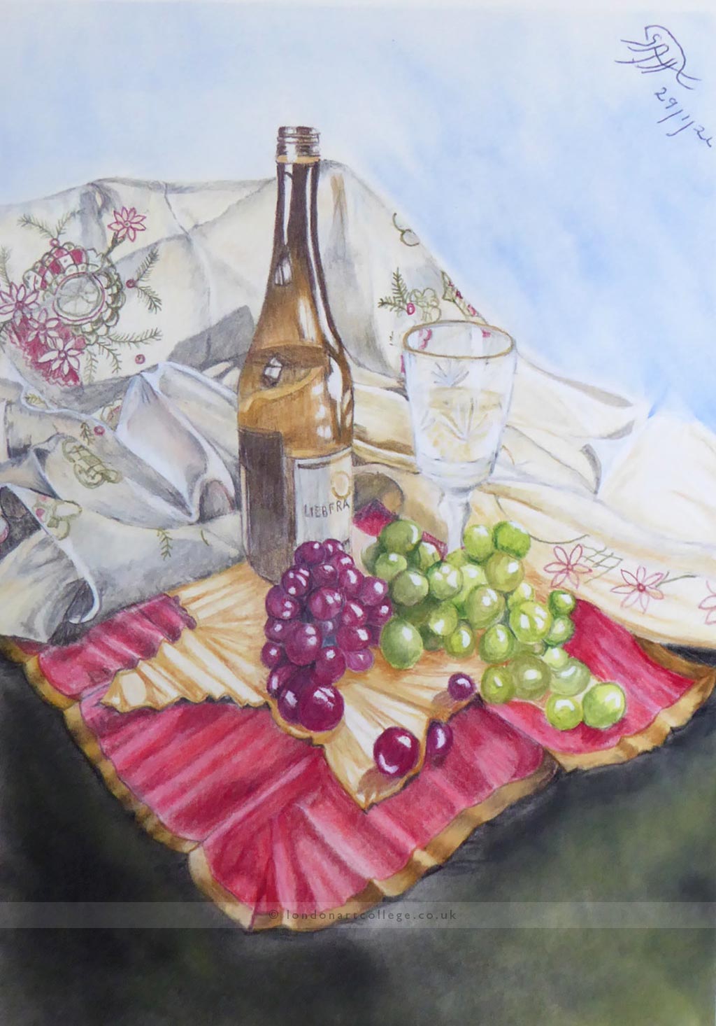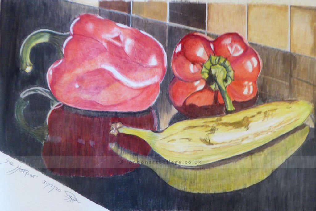 Sue Harper is a new student to the London Art college and has recently enrolled on our Coloured Pencil Art Course. She has just completed her first set of artwork, a few of which you can see below. Tutor Monika Cilmi was delighted with Sue’s artwork and said of the still life bottle collection below…