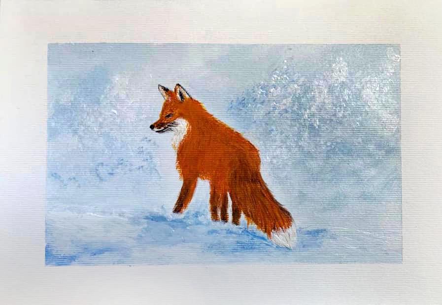 “ Winter Fox “ I painted this Christmas card from my childhood memories. Red Fox in the snow reminds me Christmas is on the horizon. I have used acrylics on acrylic paper.
