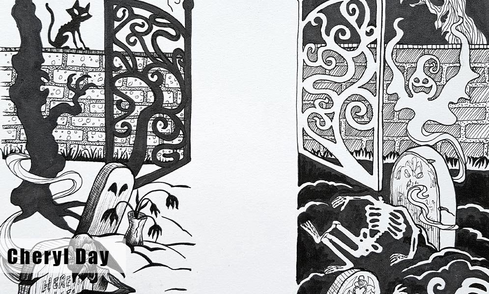 These wonderful illustrations are by London Art College student Cheryl Day on the Illustrating Children’s Books Diploma Course. They are all from the Creepy assignment, which we think are great. She has enclosed a piece which shows white pastel on black paper which is a great idea to get one’s head around the notion of working white on black and some good rough ideas. This is an excellent assignment!