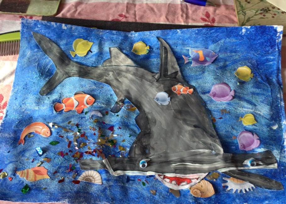 I covered an A3 piece of paper with tracing paper and painted it with children’s paints and sprinkled some silver and blue glitter over it.