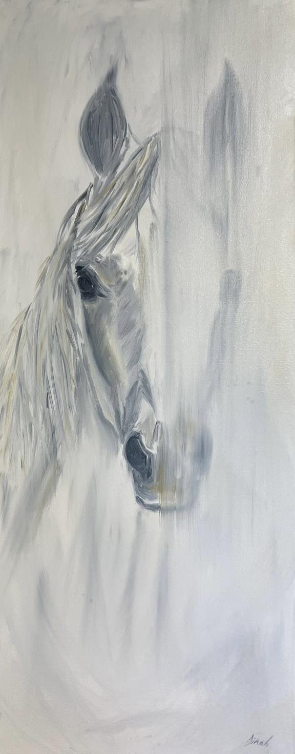 H is for Horse. I have just finished this over the weekend for my daughter’s birthday. I have called it Spirit Horse. Oil on canvas, almost life size.