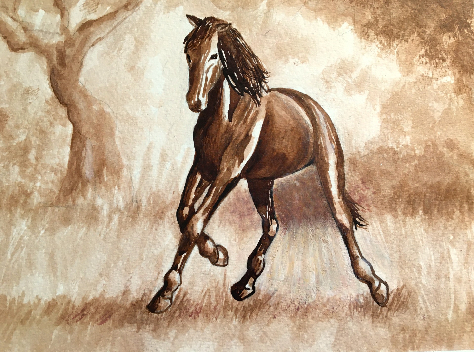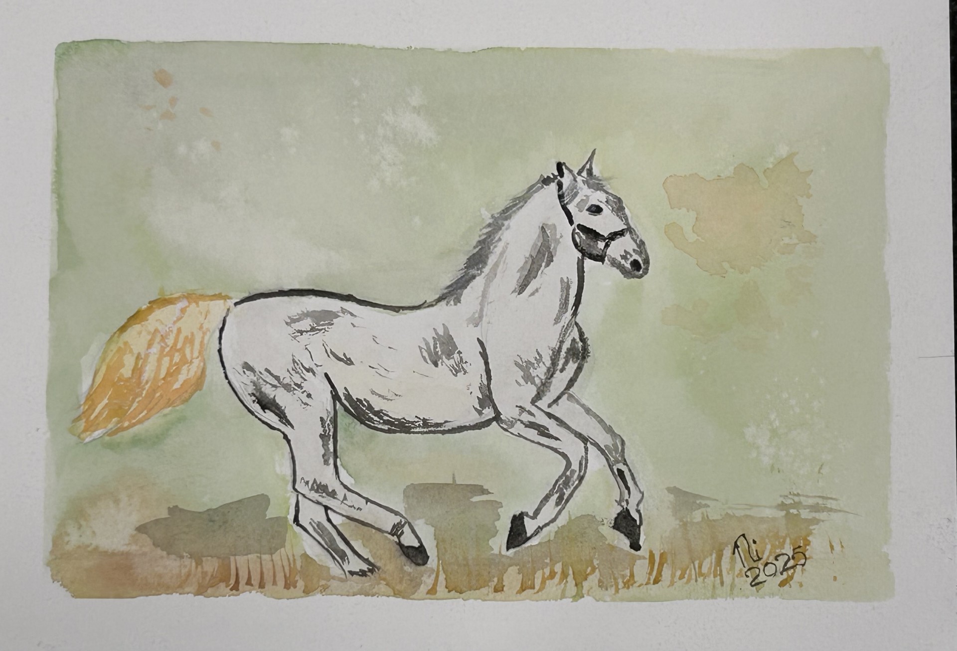 Horse with watercolour on CP watercolour paper. I also used white gouache and white pen.