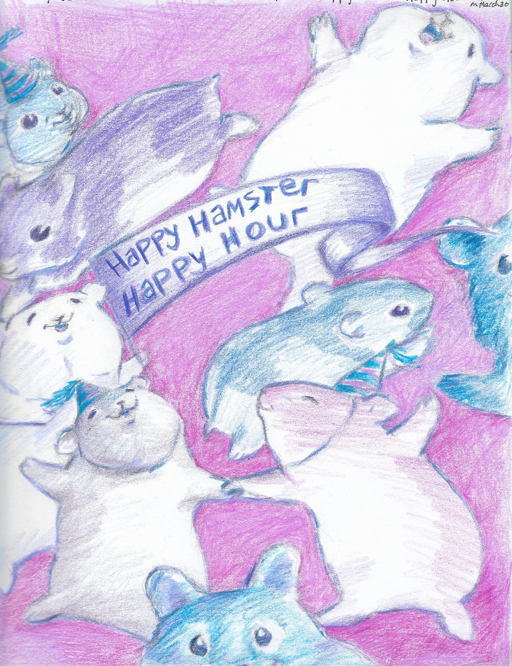 For the letter H challenge I tried using colored pencil in a more painterly way – not sure how well I succeeded – and since I love hamsters, I drew these happy hamsters’ happy hour!