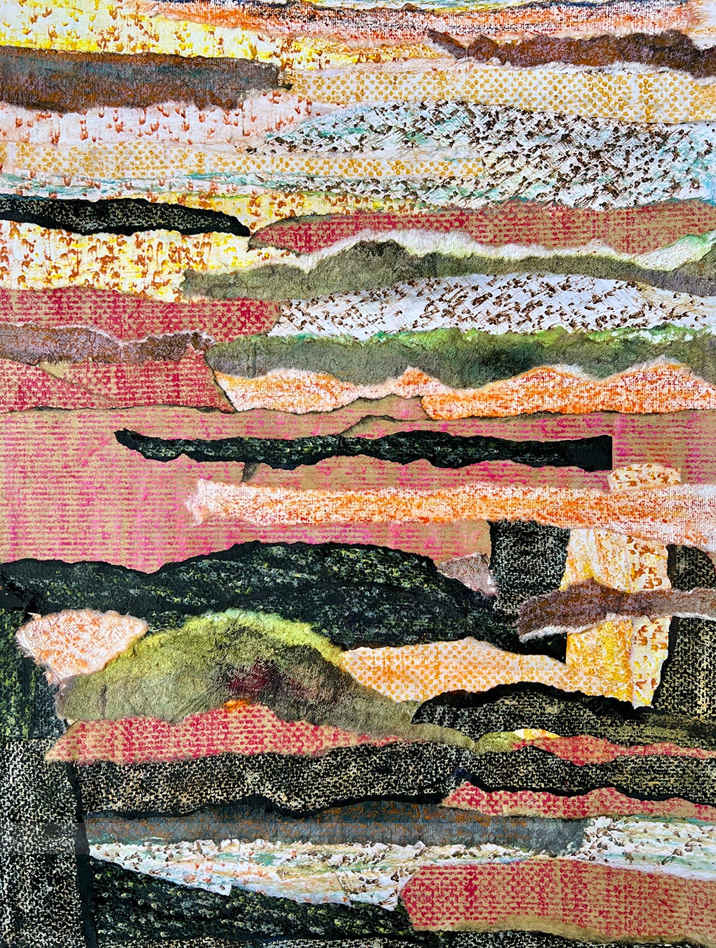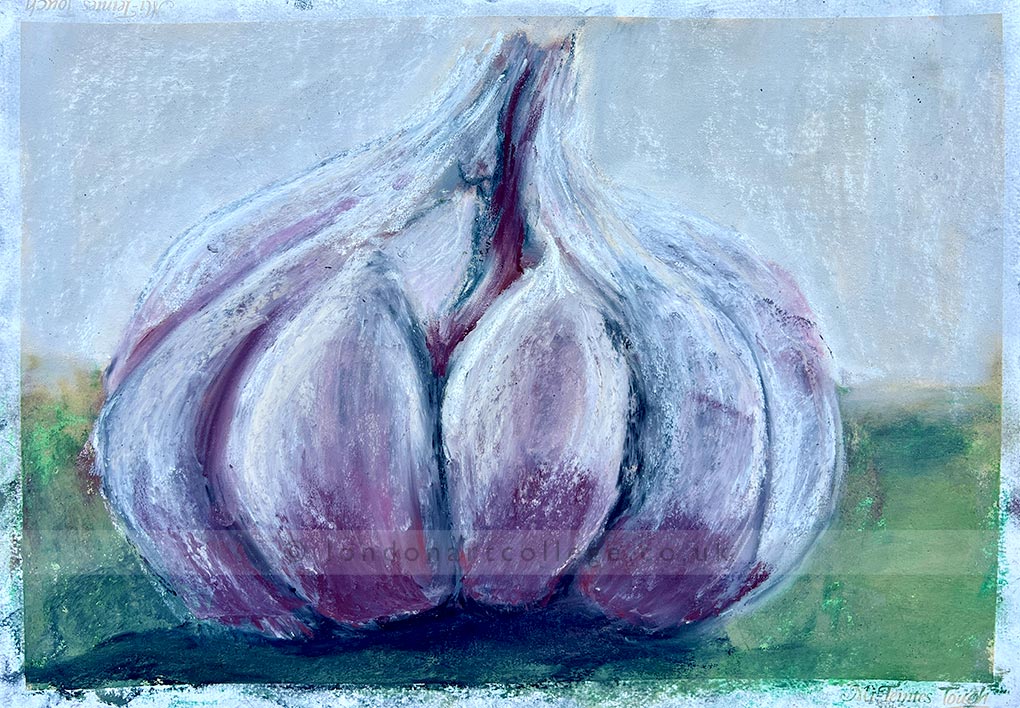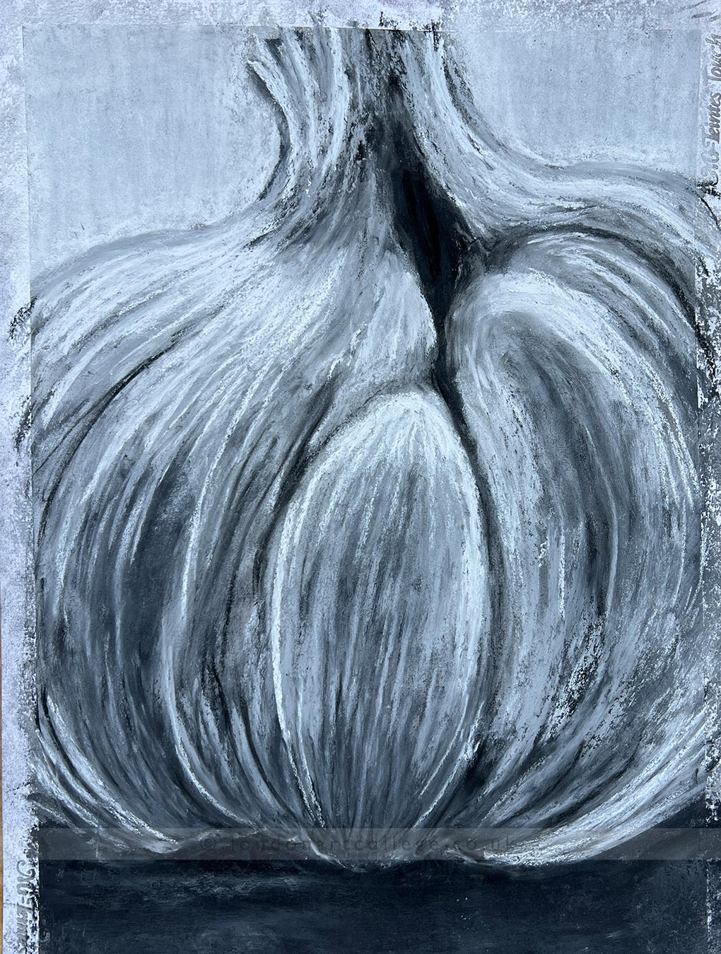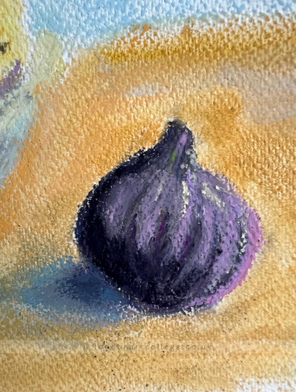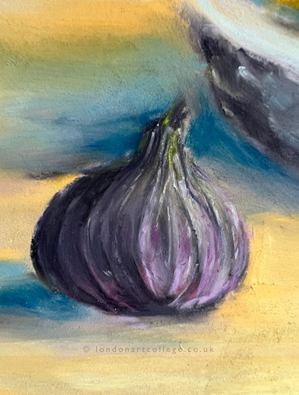 Her coursework pieces reflect a confident exploration of this medium. From bold still life studies of figs and garlic, where soft layering and directional strokes bring depth and texture, to abstract and semi-abstracts filled with movement and atmosphere.
