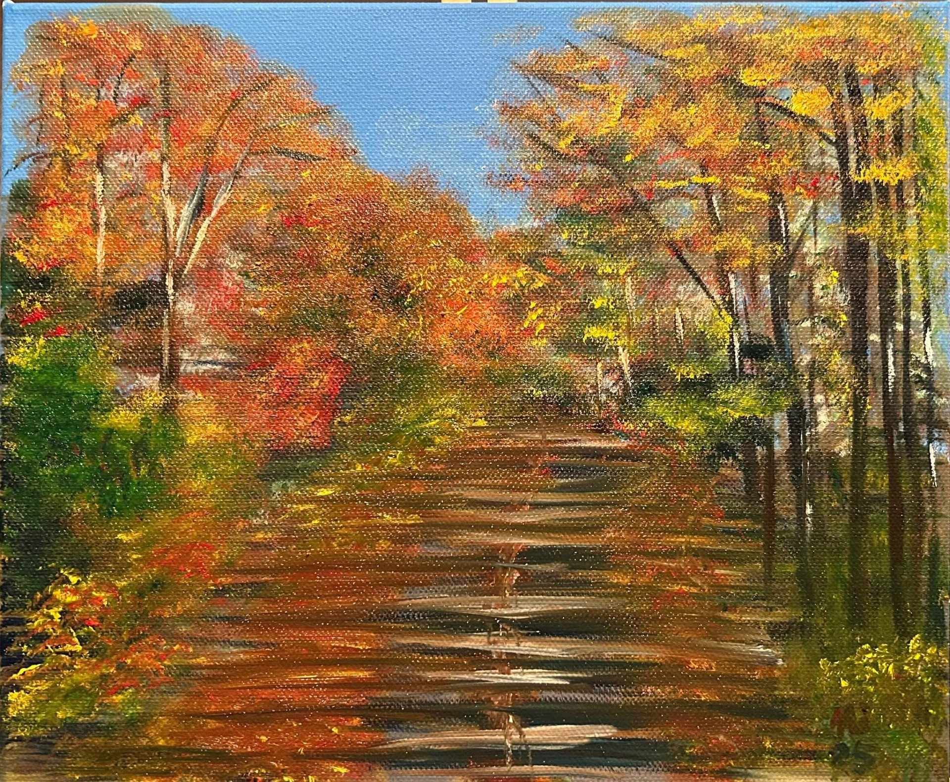 The first painting by student Ni Ni is a lovely autumn woodland scene, full of rich colour and warmth. There’s great use of texture in the trees and a real sense of depth in the path leading through the centre.