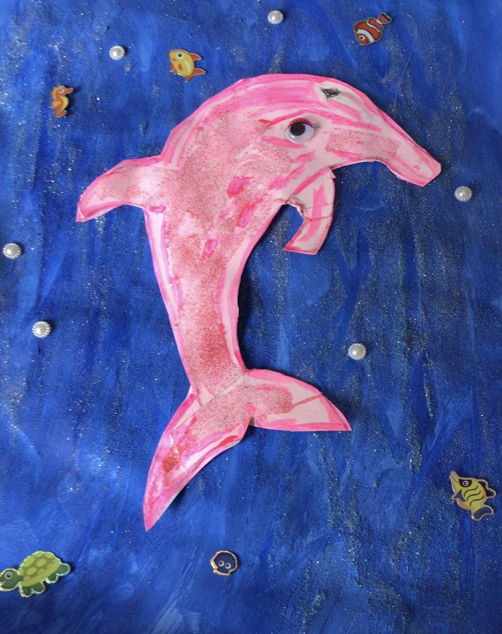 I did 2 small pieces this challenge. The one on the left is a pink dolphin. I used both children’s and acrylic paints with glitter on both the background and dolphin. Stickers and goggley eye used.