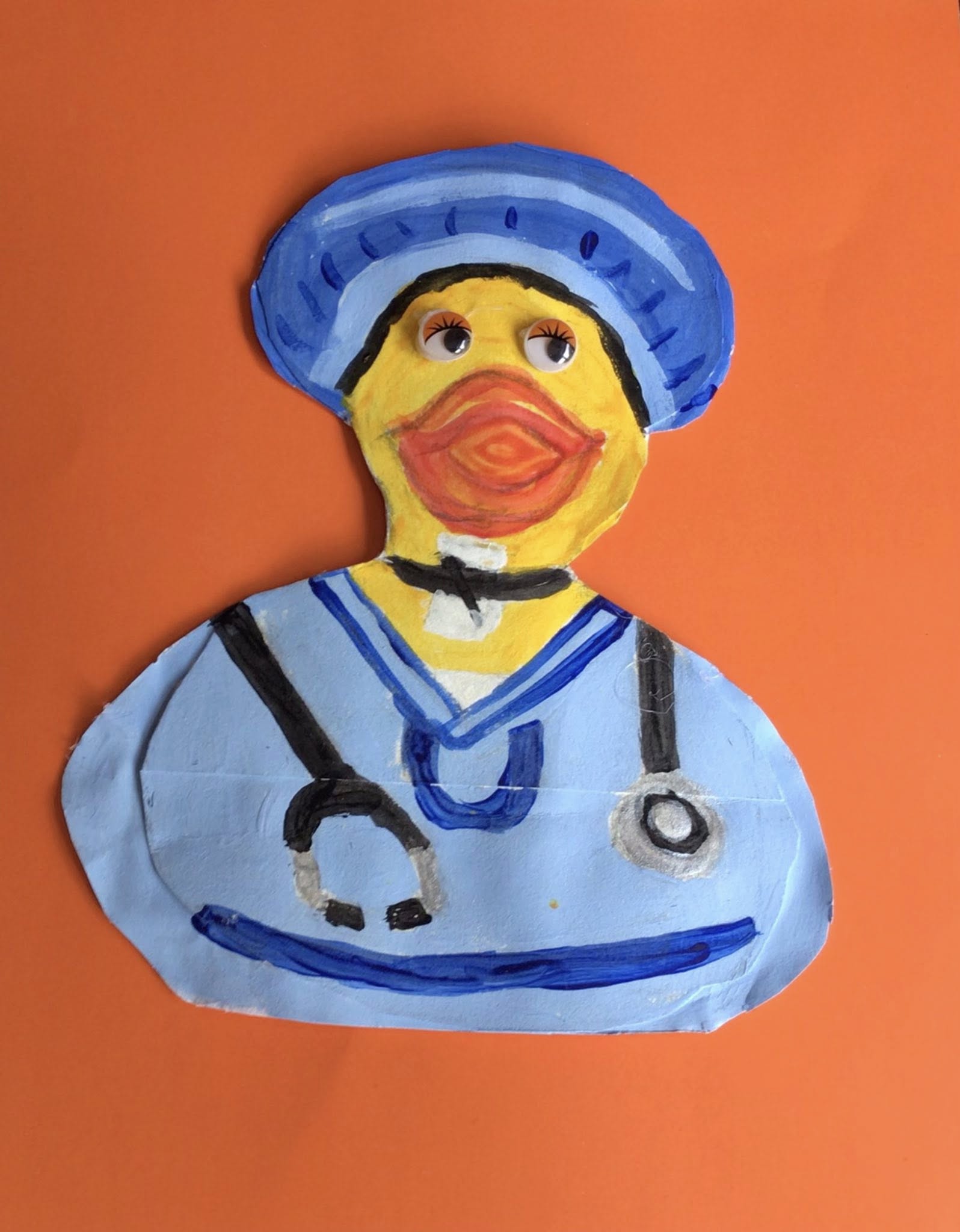 The one on the right is Dr.Duck. Acrylic and children’s paint used plus goggley eye.
