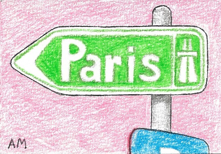 Colored pencil drawing of a signpost at a highway rest stop on my way to visit the house where Van Gogh stayed for 2 years near Mons, in Belgium. Obviously it’s Direction…