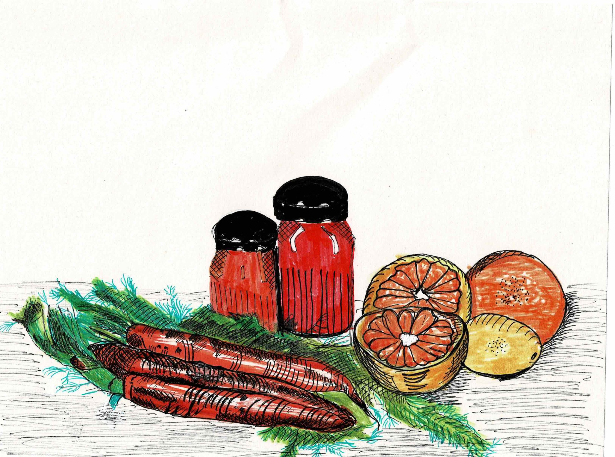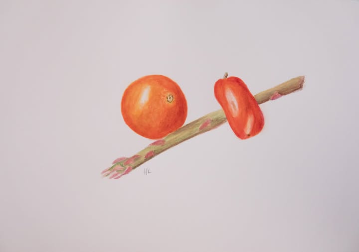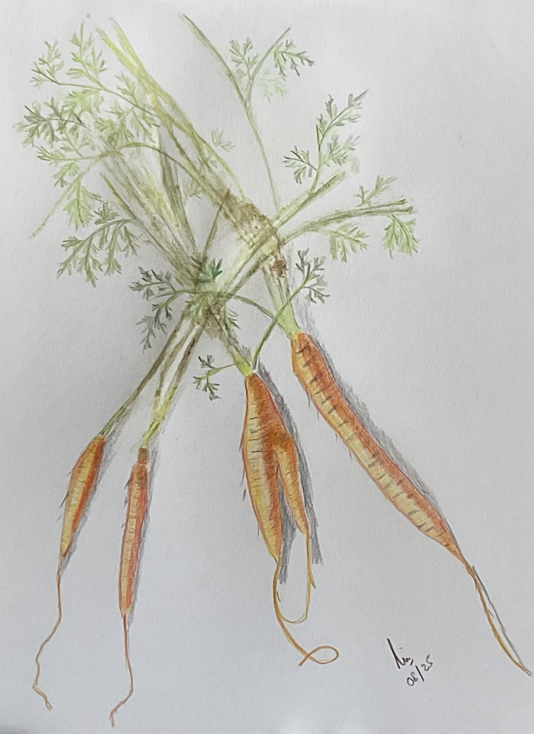 Carrots study: stems are crushed on the cartridge paper to get imprints. I tried to get the leaves also but it didn’t work. Created with pencil and polychromos coloured pencils on A3 paper. Stems and some dirt are natural colour.