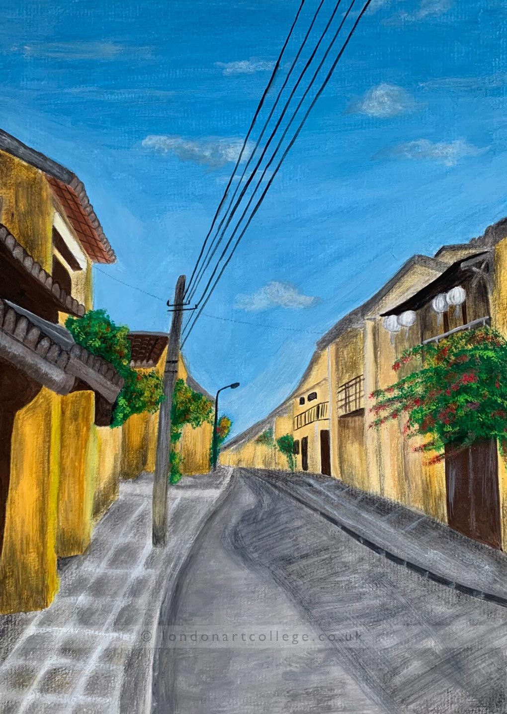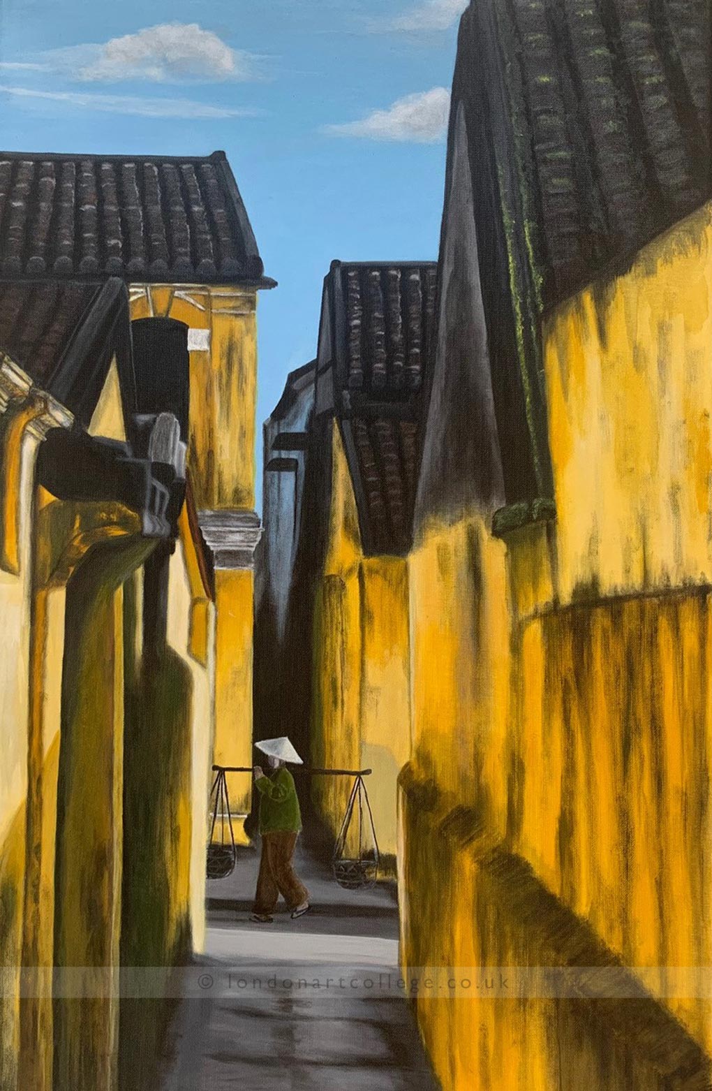 Hanh is based in Vietnam and has worked extremely hard throughout the course, producing a beautiful body of work inspired by her surroundings. Her paintings capture scenes of Vietnamese life, from rice fields and village streets to traditional architecture and waterways, bringing a refreshing perspective and a rich cultural flavour to her studies. Paul commented on how rewarding it was to see such unique and varied subjects, making a welcome change from the more familiar landscapes he usually receives.