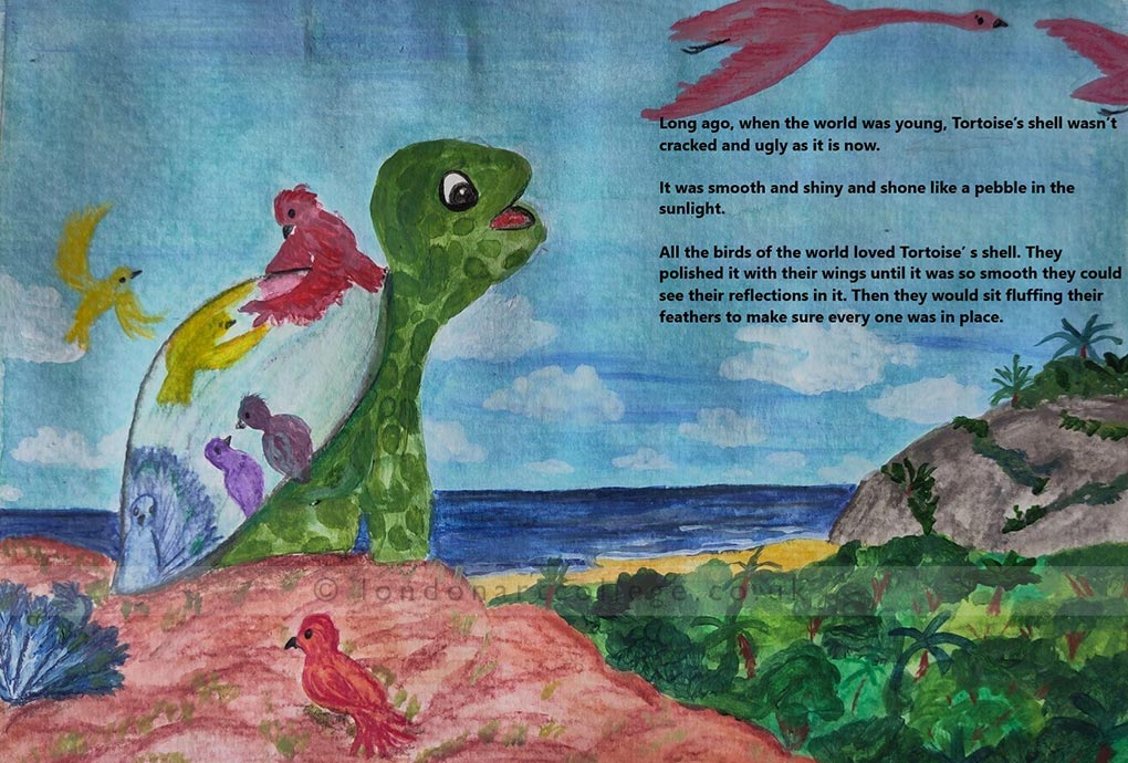 Loraine Wallace took a softer, more naturalistic approach, with delicate washes of watercolour and detailed foliage. Her tortoise feels grounded in its landscape, and the scene has a gentle, storybook calmness that draws the reader in.