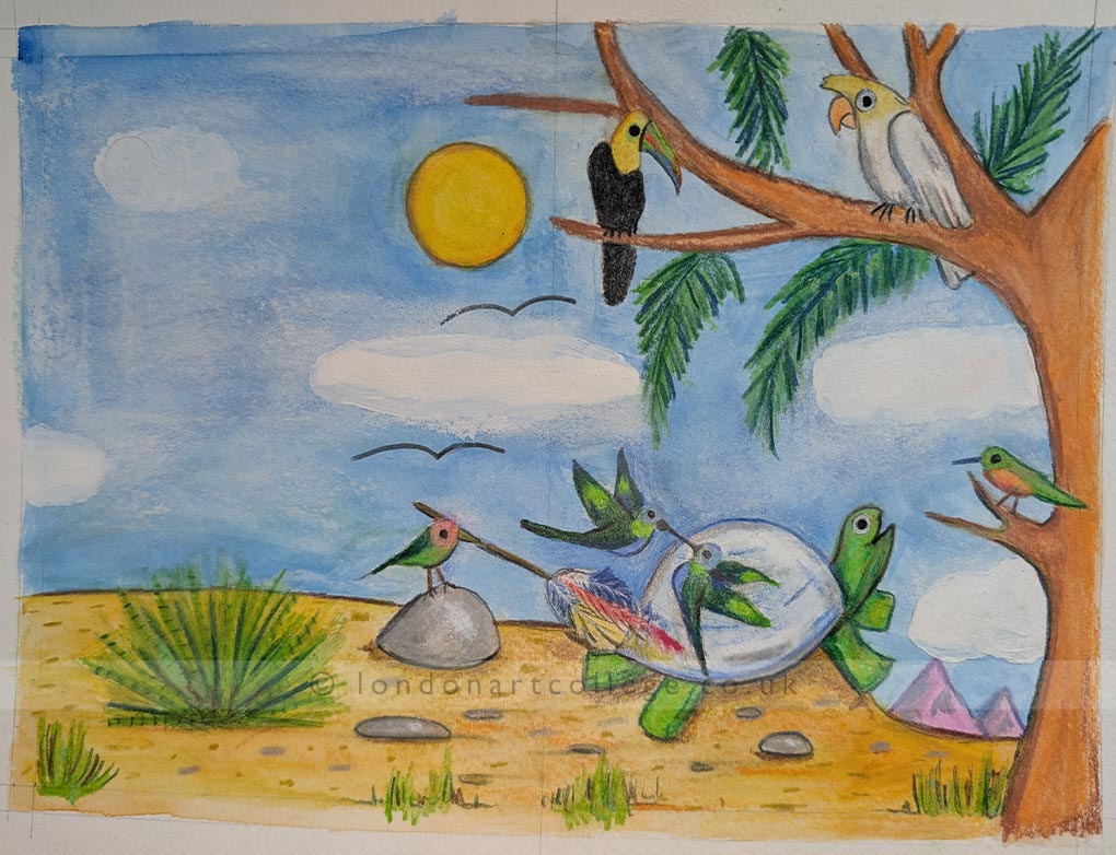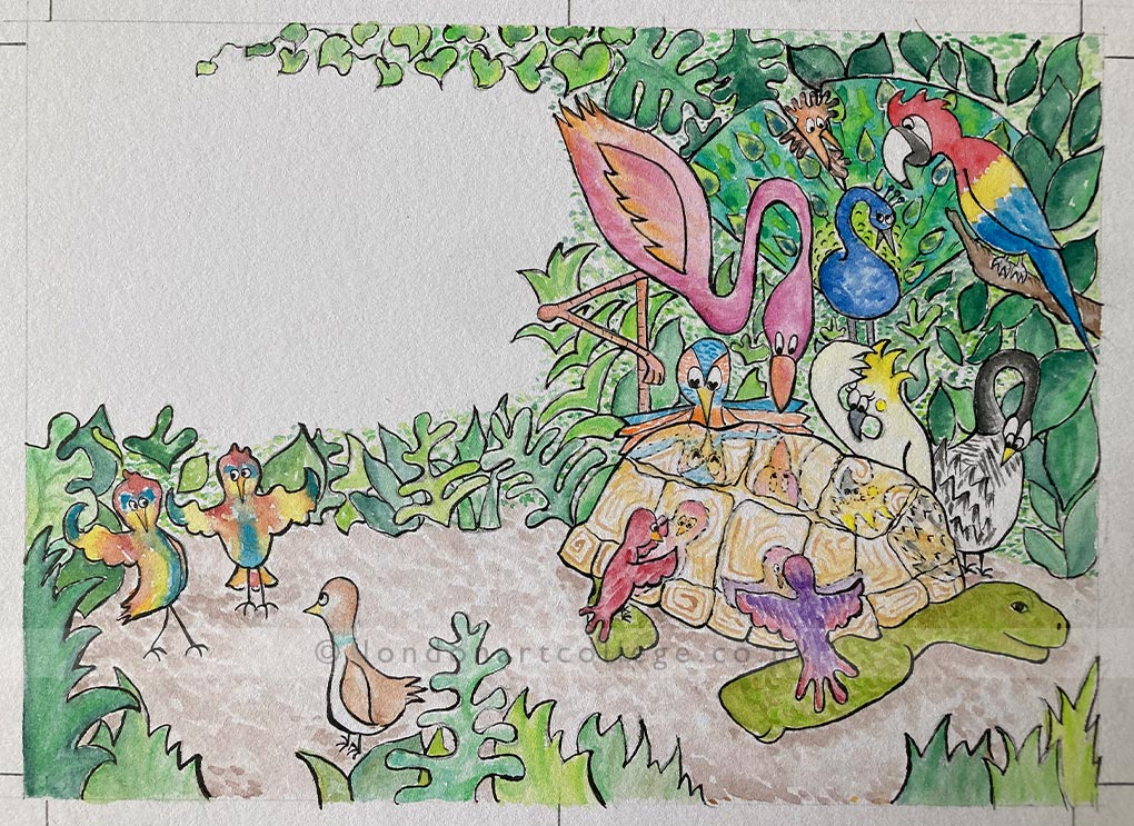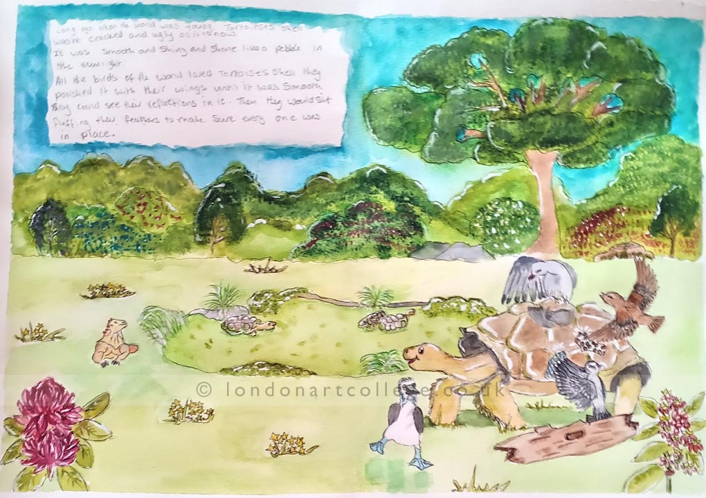 One of the most inspiring aspects of the Illustrating Children’s Books Diploma Course is seeing how each student approaches the same brief in completely unique ways. Recently, our students were set the task of illustrating a scene based on a short passage of text about a tortoise and a group of colourful birds. Although everyone was working with the same starting point, the results could not be more different, a brilliant reminder of how creativity flourishes when imagination takes the lead.