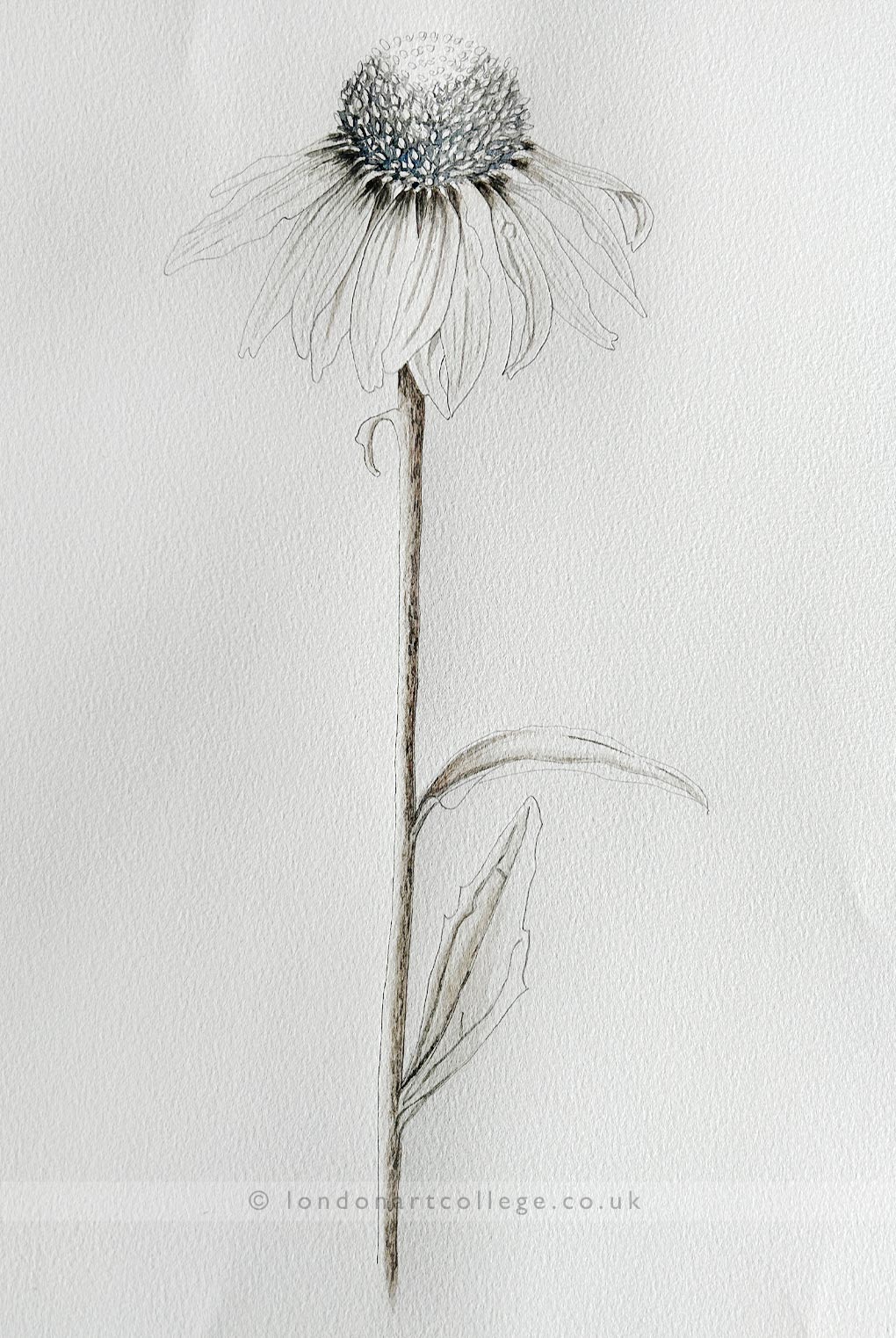 “It was interesting to see how the tonal drawing does meld into the colour painting, I thought it would overpower the work, but it doesn’t… It is a flower I have always wanted to paint, and I’m glad I gave it a go. I would like to have another try, to see if I can do a really accurate representation of the solidity of the cone in comparison to the delicacy of the petals.”