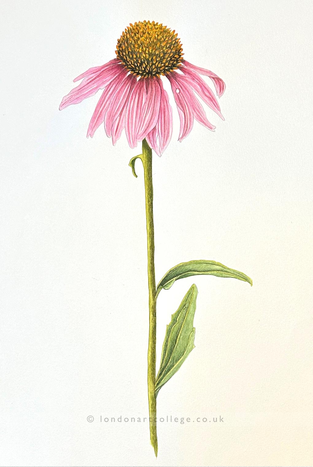 We are delighted to share the stunning work of student Lisa Dickinson, who has been working on her Botanical Painting Diploma Course with us. For her latest assignment, Lisa chose to study and paint the Echinacea Purple Coneflower (Echinacea purpurea ‘Magnus Superior’) – a striking flower from the daisy family, Asteraceae, which also includes sunflowers.