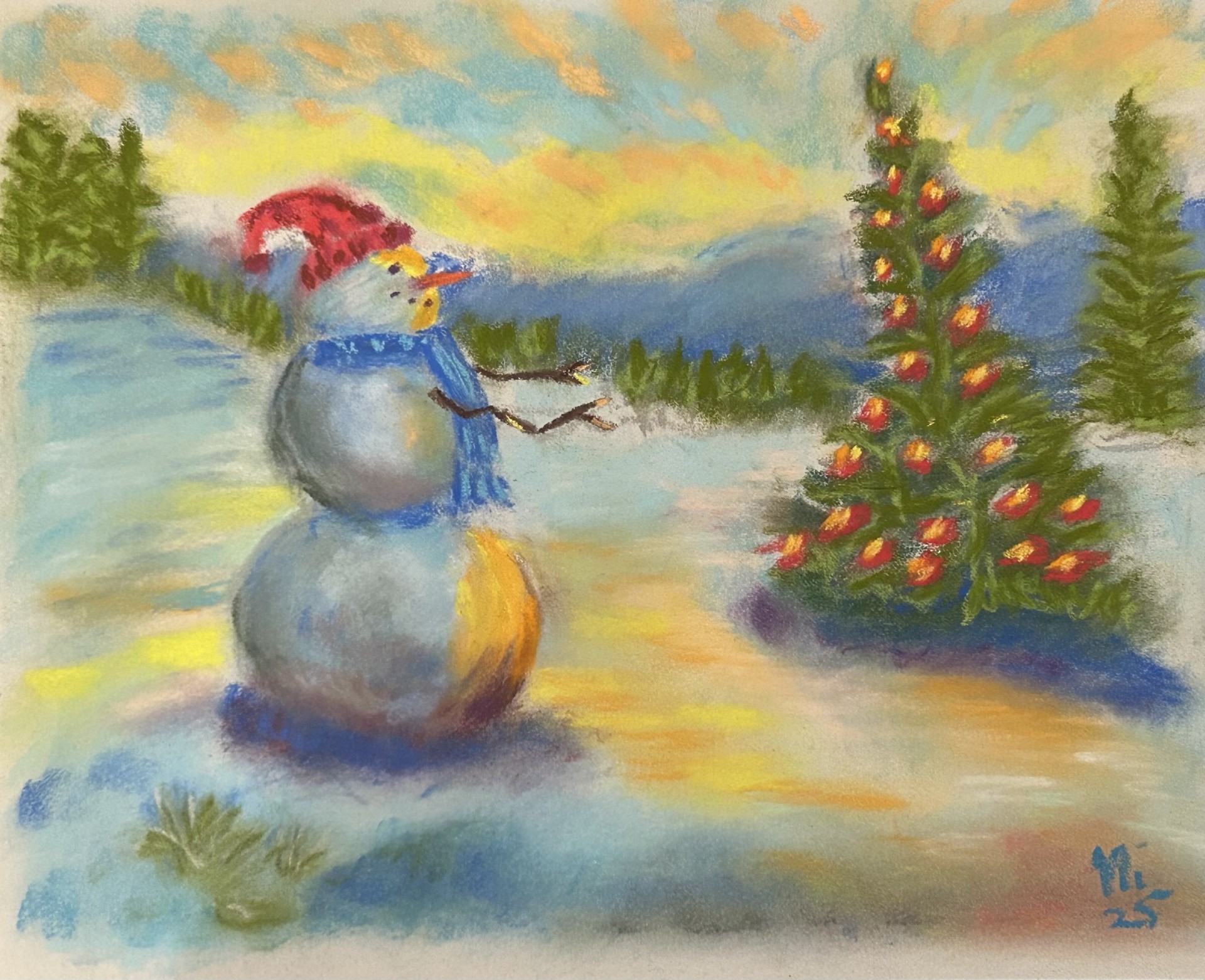 Snowman Christmas scene with soft pastels on pastelmat after watching Susan Jenkins YouTube video tutorial.