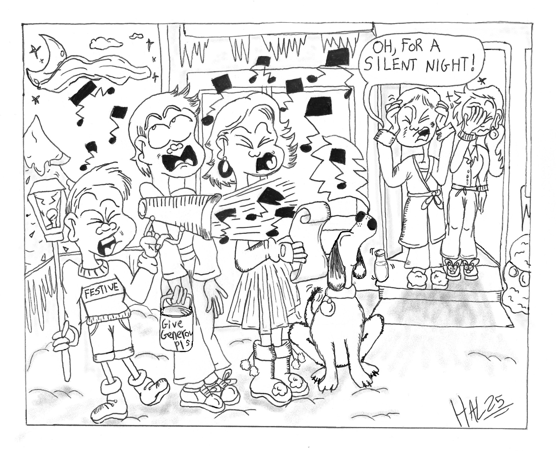 A hand-drawn cartoon of Carol Singers inspired by the fun and frolics in the Beano comic, but with the characters drawn in my own style.
