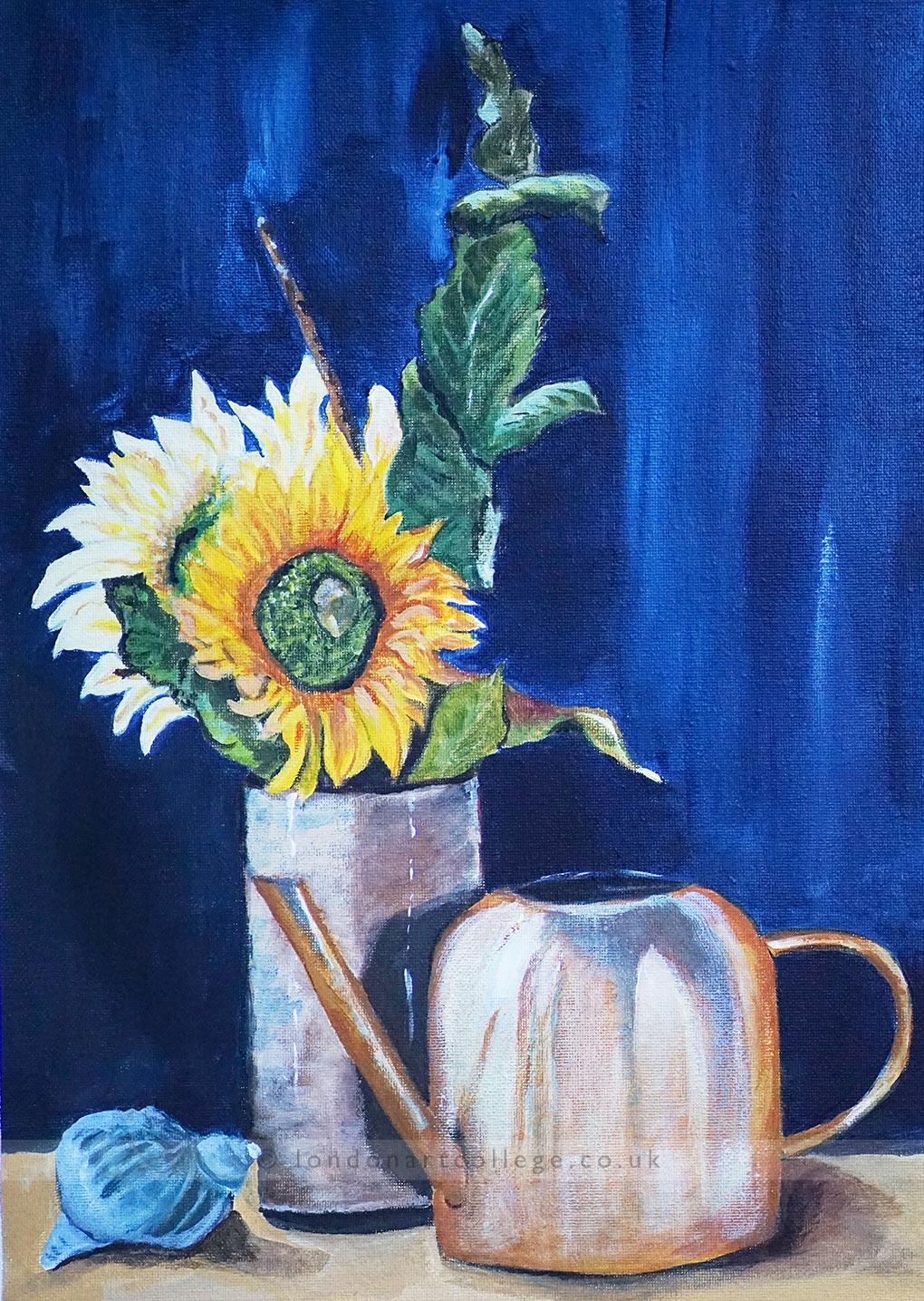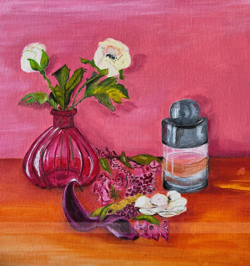 Barbara has explored a range of subjects across the course, from floral arrangements to everyday objects, using bold colour choices and confident brushwork to bring each composition to life. We especially love the inverted bottles painting which create a playful and imaginative composition.