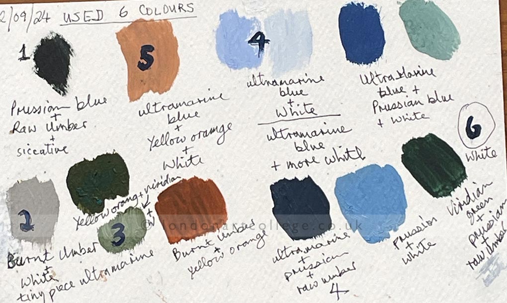 One of the strengths in Anne’s work is her growing understanding of colour mixing and surface handling. Her studies show careful consideration of tonal balance, particularly in more limited palettes, where restraint plays an important role in achieving cohesion. The colour tests and preparatory work highlight a methodical approach, building knowledge before moving into more complex compositions.