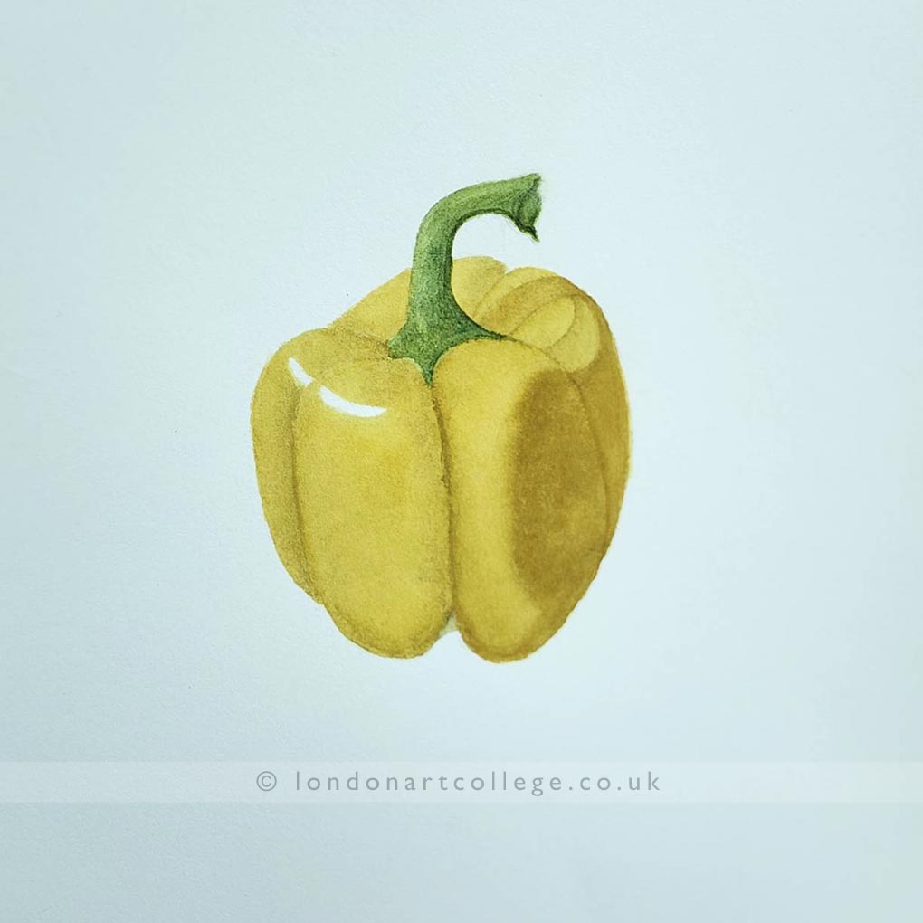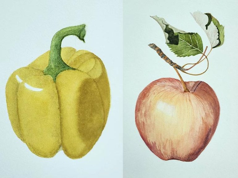 These two pieces, a softly glowing apple and a sunshine-yellow bell pepper, form part of Assignment 5: Fruit and Vegetables, and they are a wonderful example of the skill and observation that botanical painting demands.