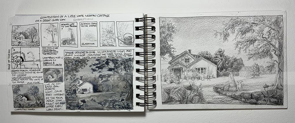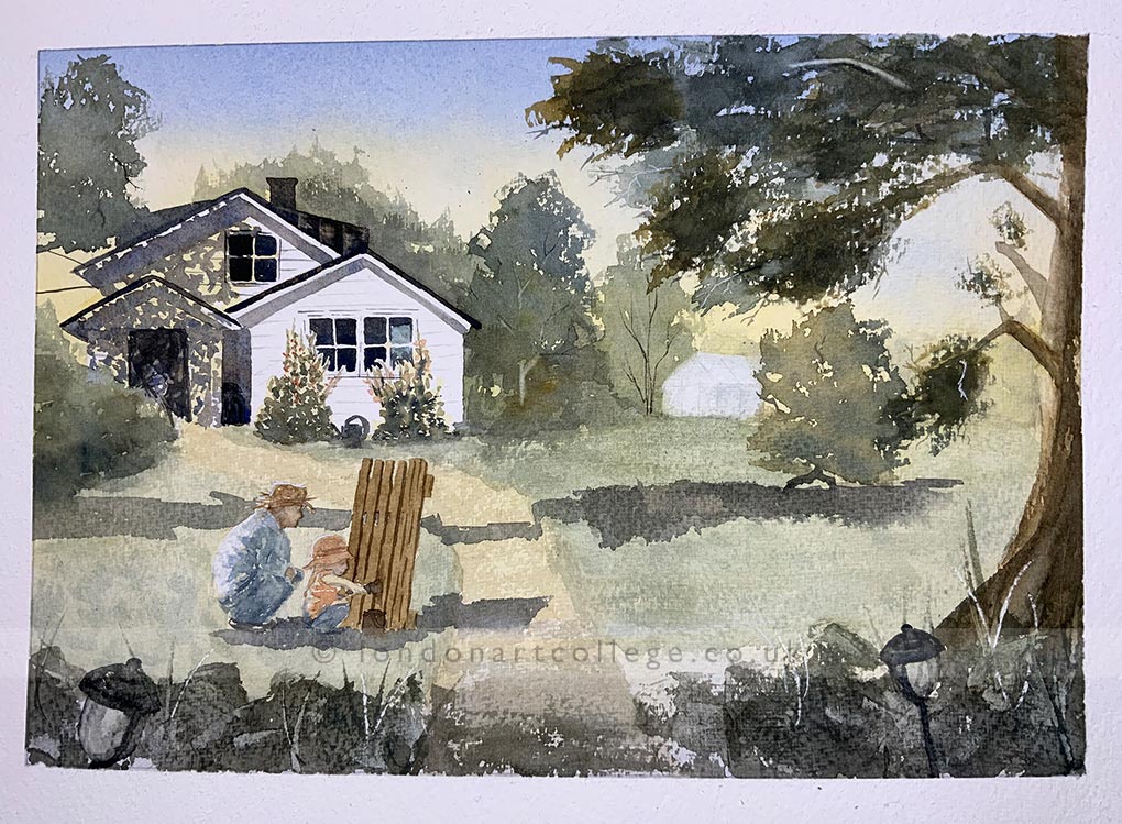 Maren’s work shows a confident and sensitive approach to watercolour, with a strong understanding of composition, tonal balance, and atmosphere. The progression from initial sketches through to finished paintings is particularly impressive, demonstrating careful observation and thoughtful decision making at each stage. The handling of light, foliage, and architectural detail feels natural and assured, with a lovely sense of calm running through the scenes.