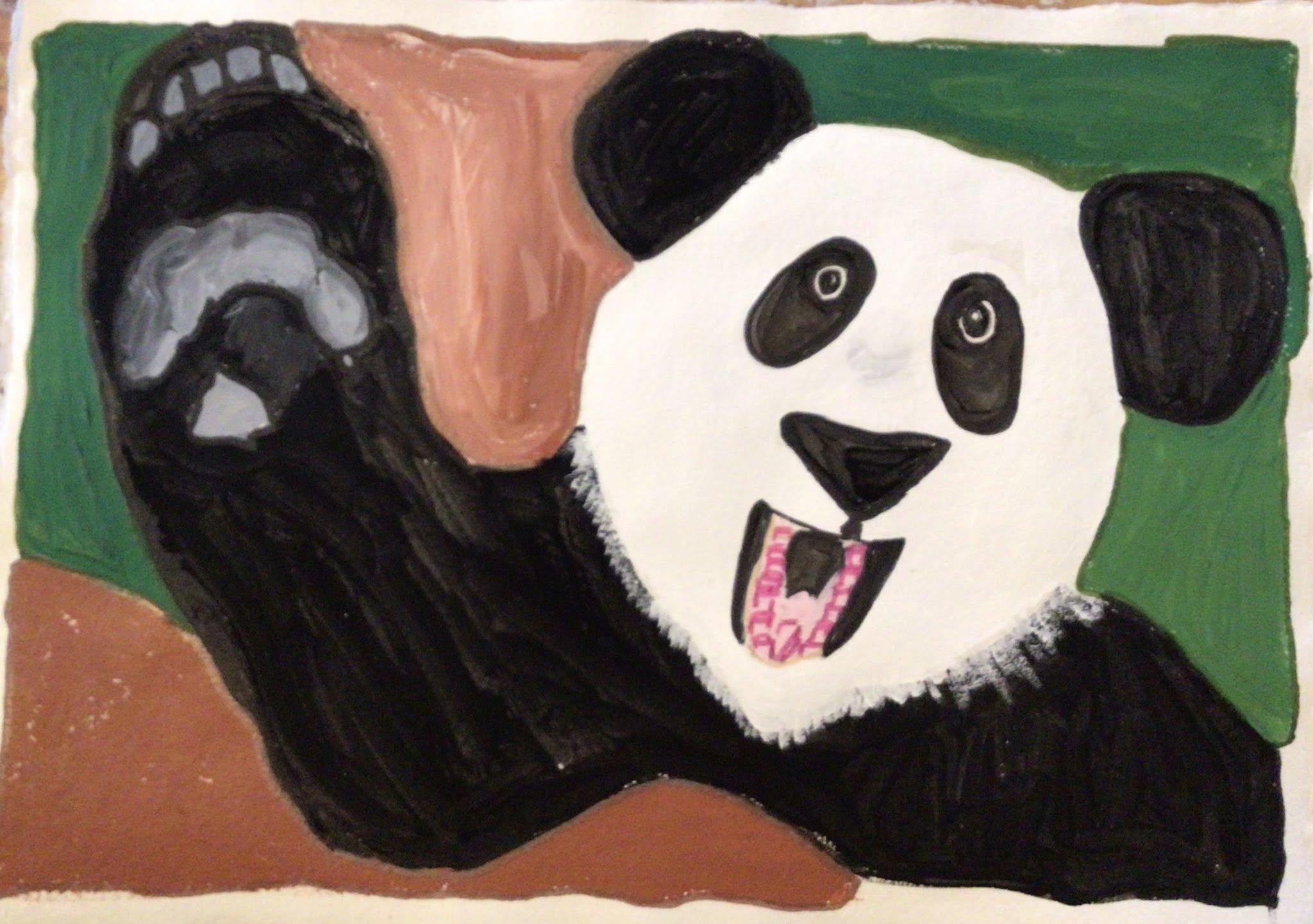 On the left is a friendly panda waving hello to everyone. Again acrylic paint and pens have been used.