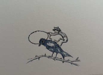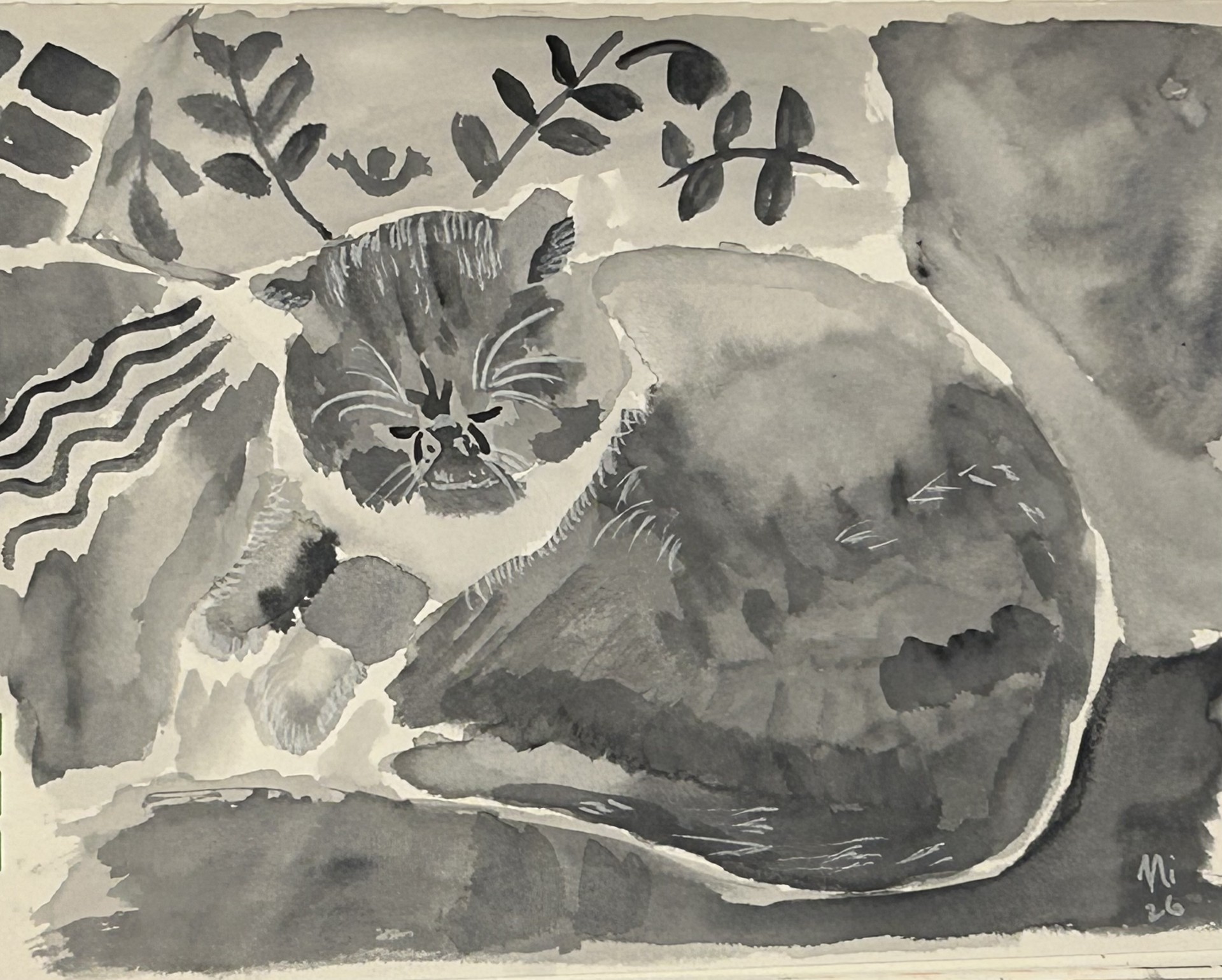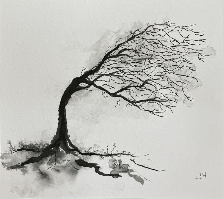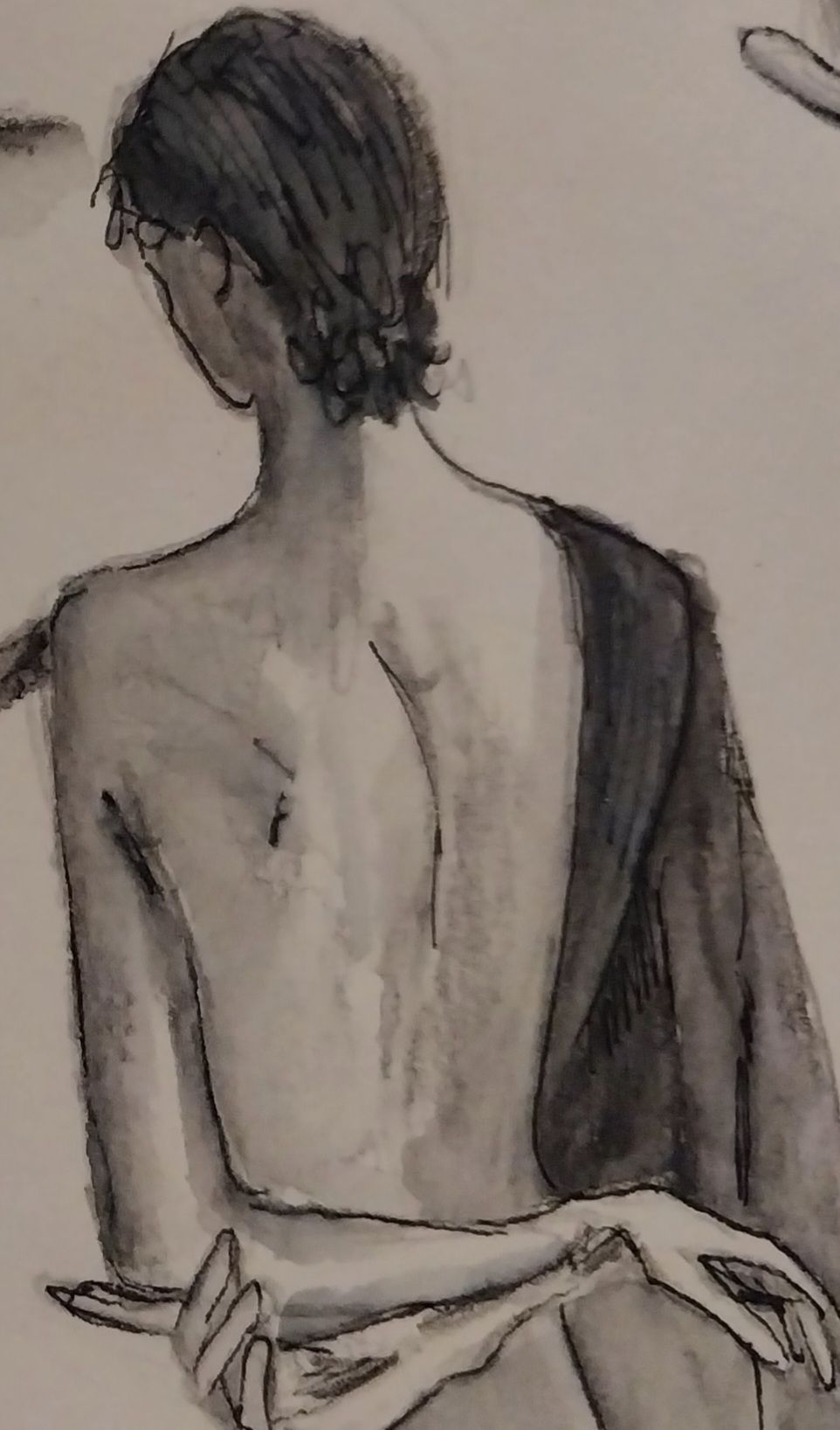 Watercolour Payne’s grey only and white pen used. No pencil sketch.