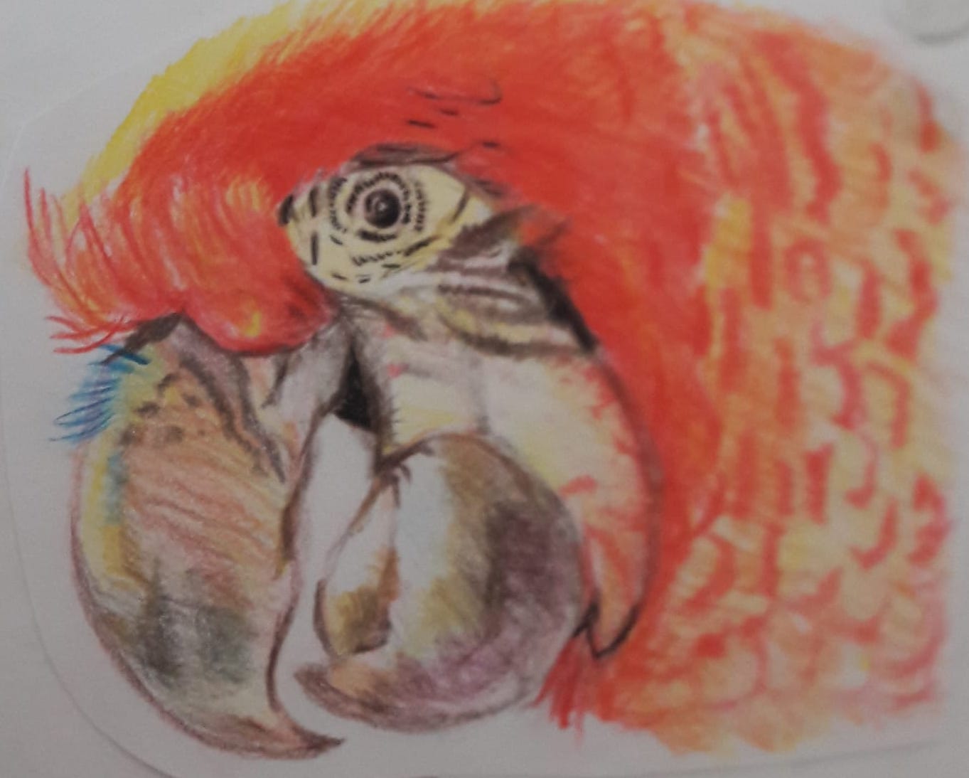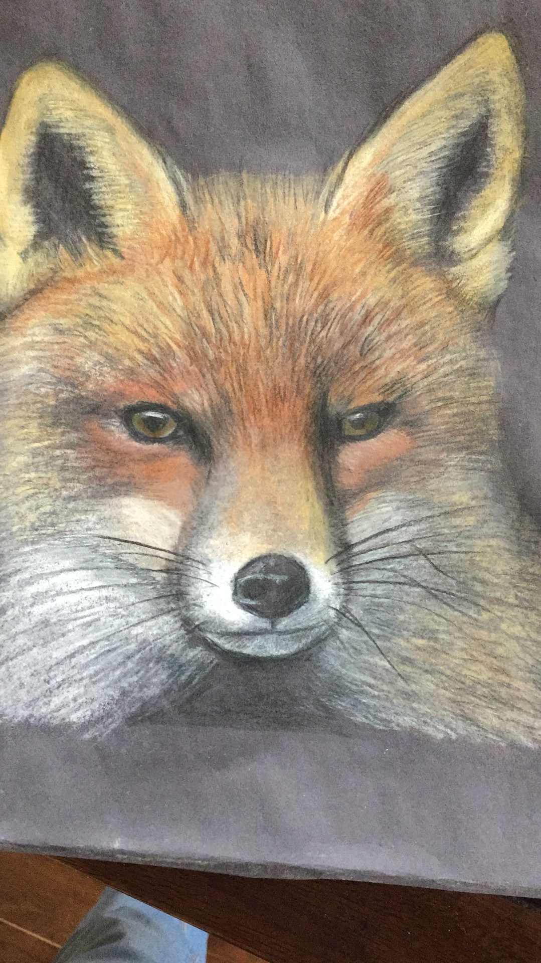 This coloured pencil and pastel picture of a fox was done on coloured paper to provide a contrasting background.  We get a lot of foxes in our garden.
