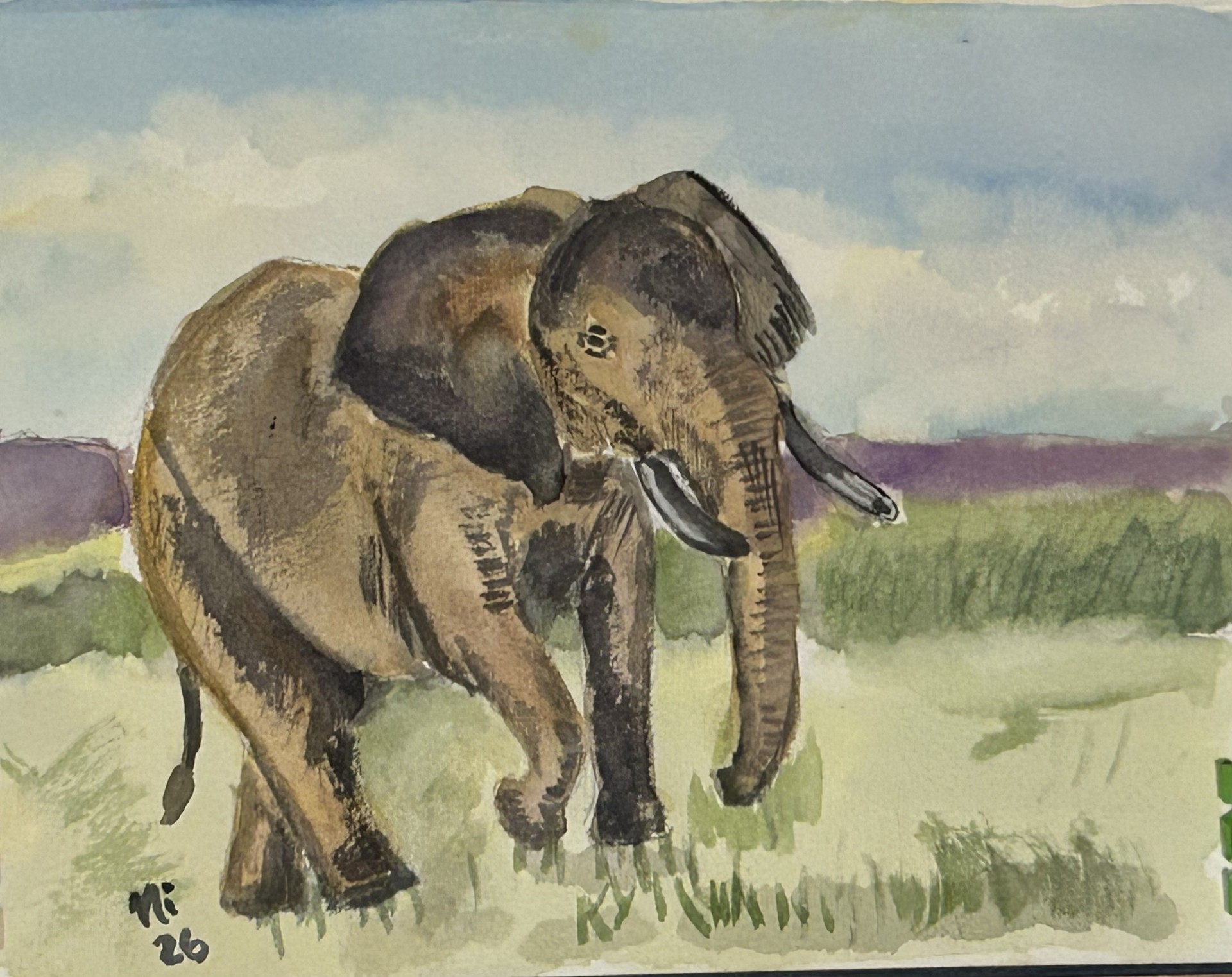 Elephant with watercolour in watercolour visual journal, A4 size.