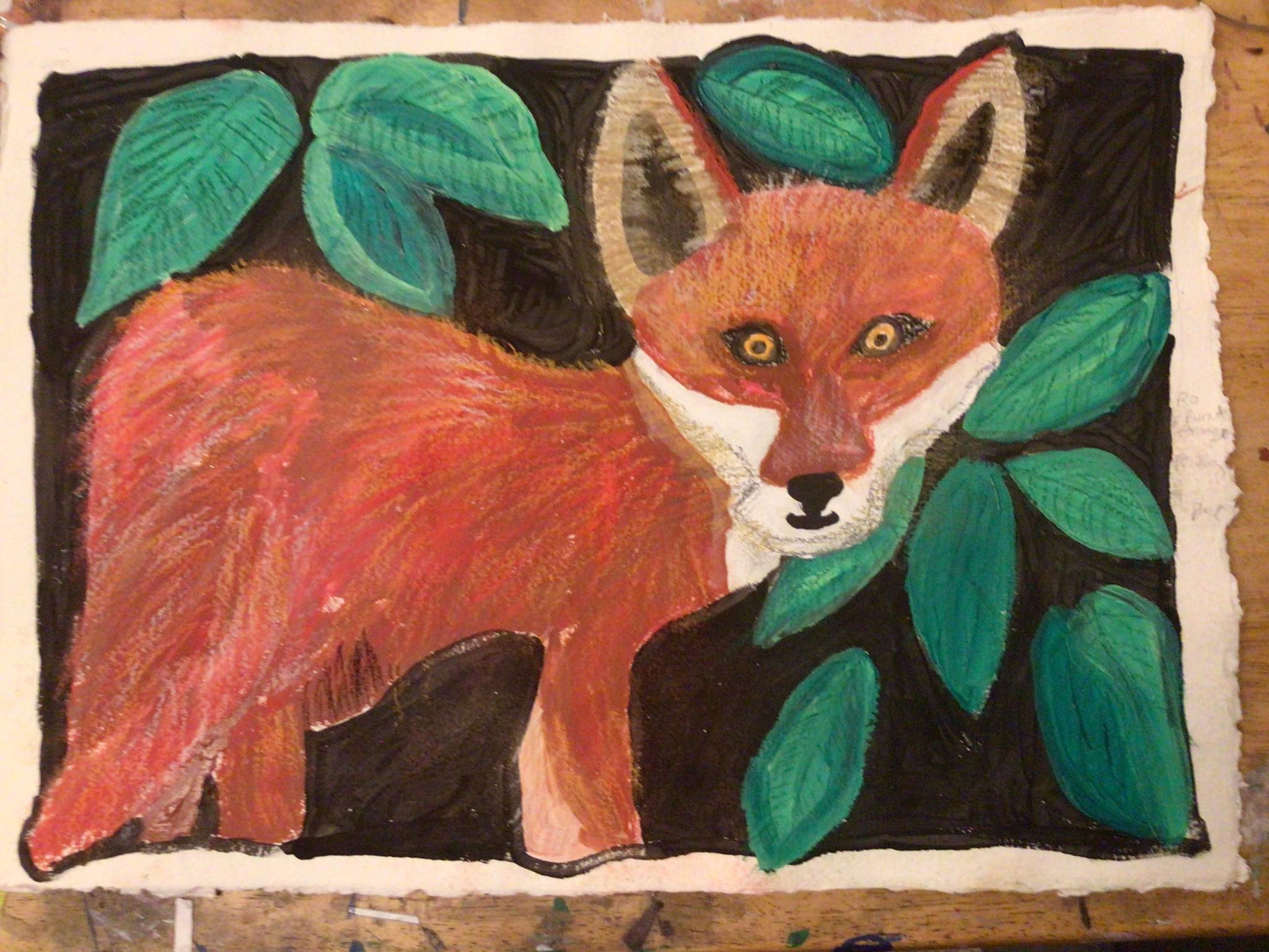 Weekend Challenge: The amazing Mr.Fox. This is a mixed medium piece of artwork. Acrylic paint and felt tip pens, children’s paint and chalk pastel pencils have been used.