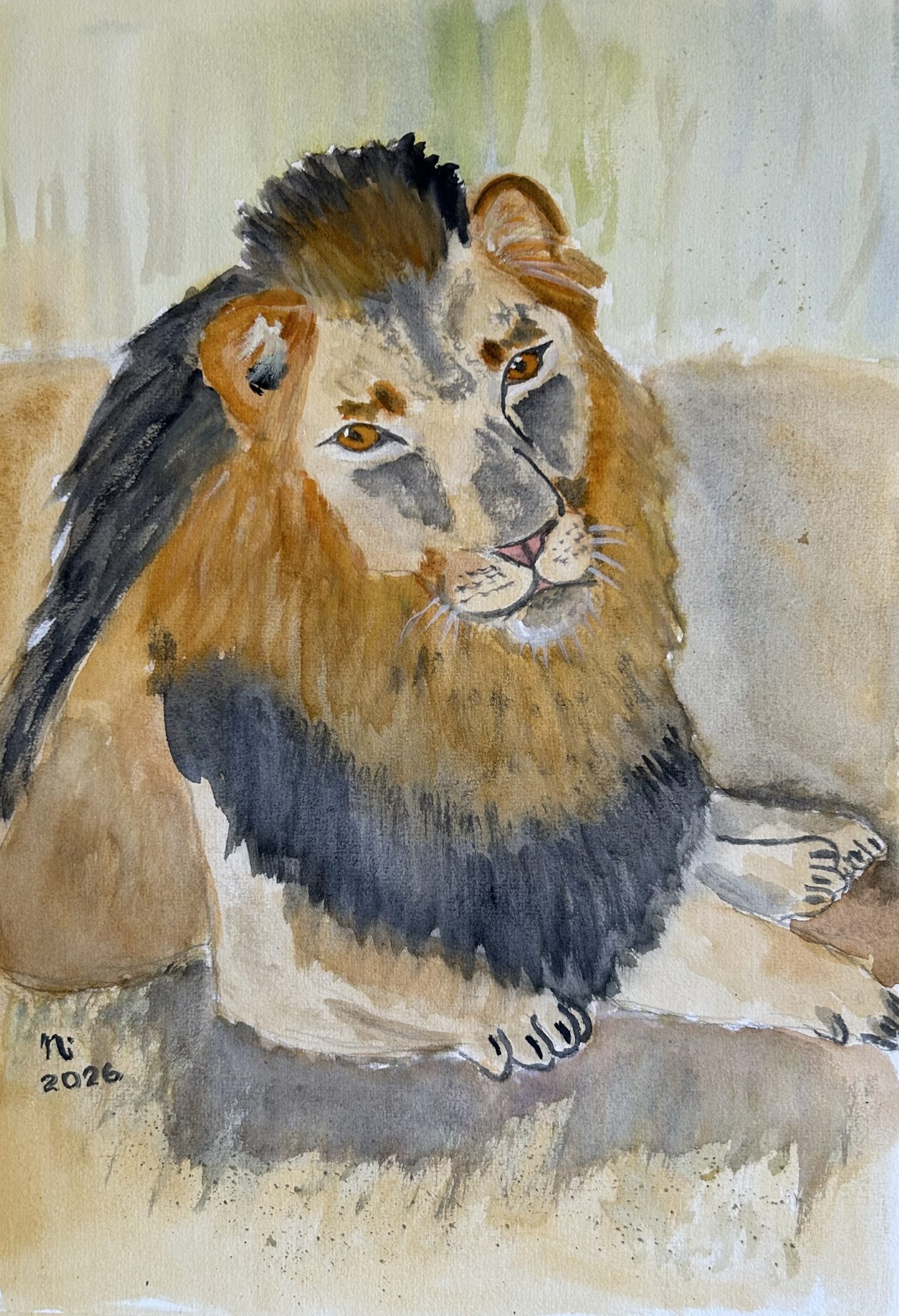 Lion with watercolour and white gouache on watercolour paper.