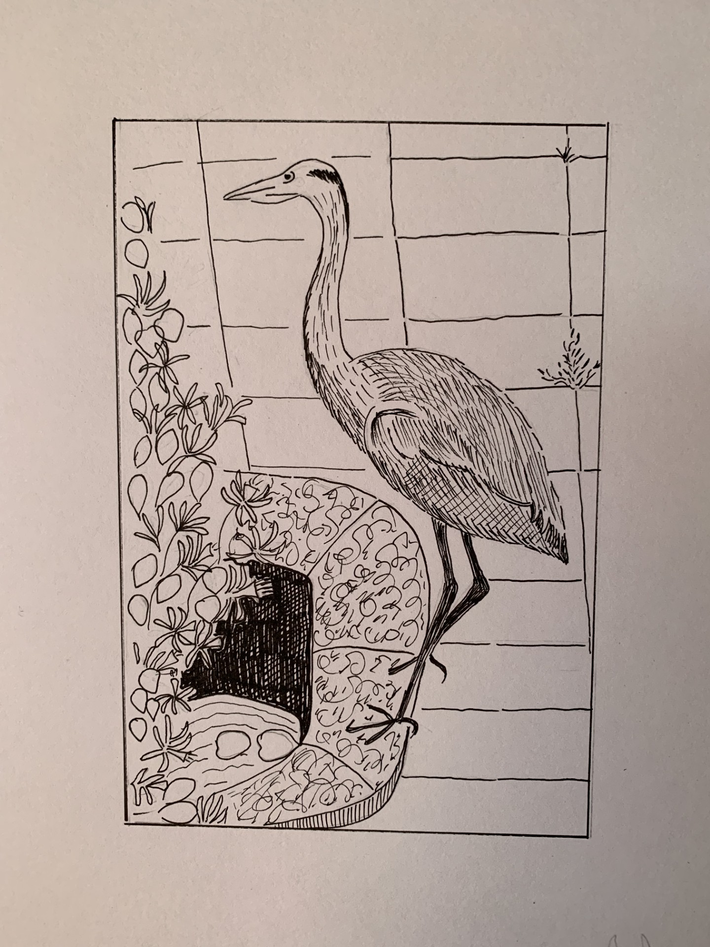 I have drawn the heron that visits my daughter’s garden and is interested in the raised fishpond on her patio.  She took a photo last Summer.  I am just starting to learn pen and ink drawing.  The bird’s body is too big – more like an ostrich!  It was fun drawing it.