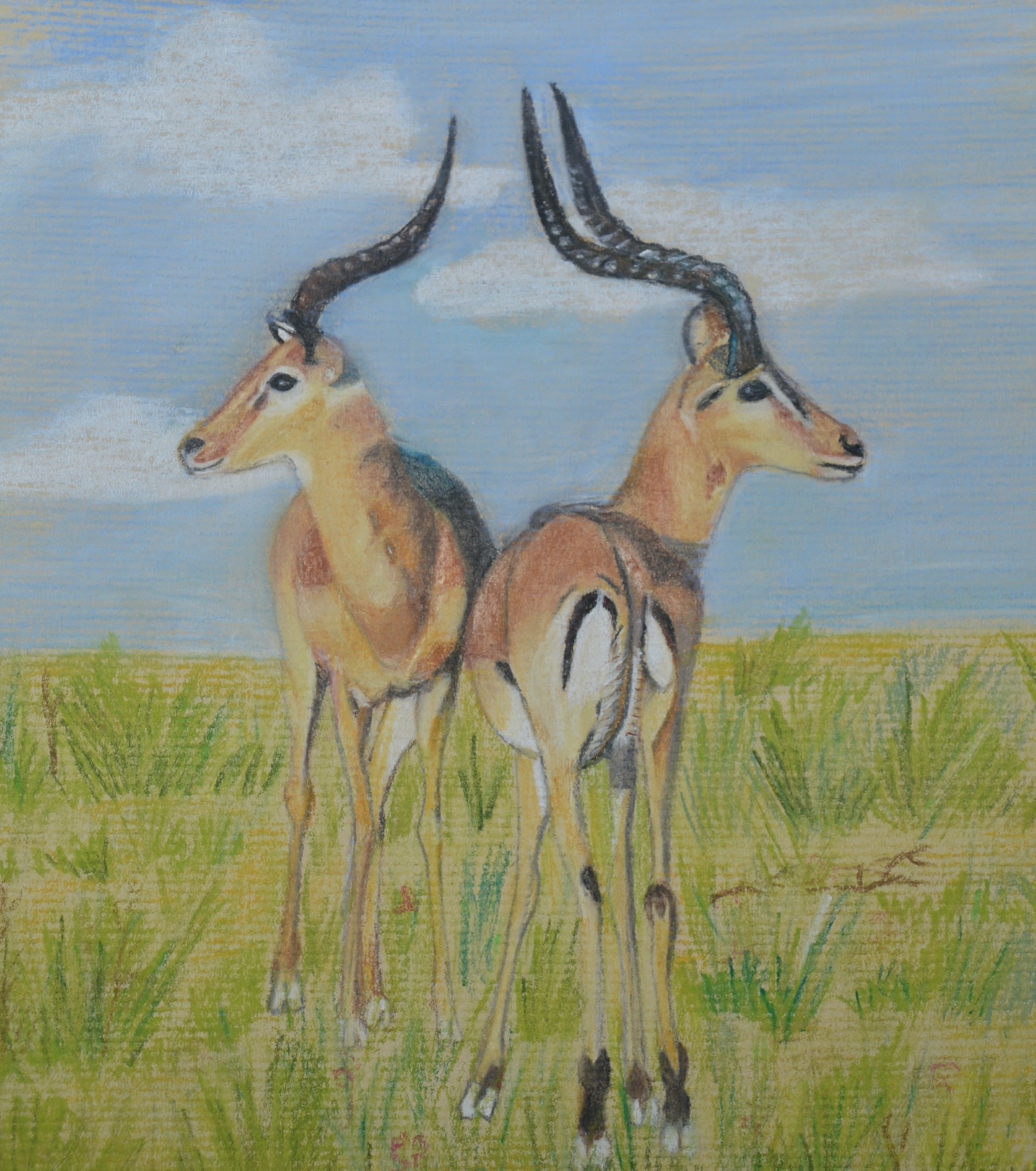 These are 2 male impalas from the Southern African bush.I drew them using pastel pencils from a bought photo. The one that seems to be drawn with one horn is not missing the other one. They are  parallel to one another so you can’t see them both in this picture.