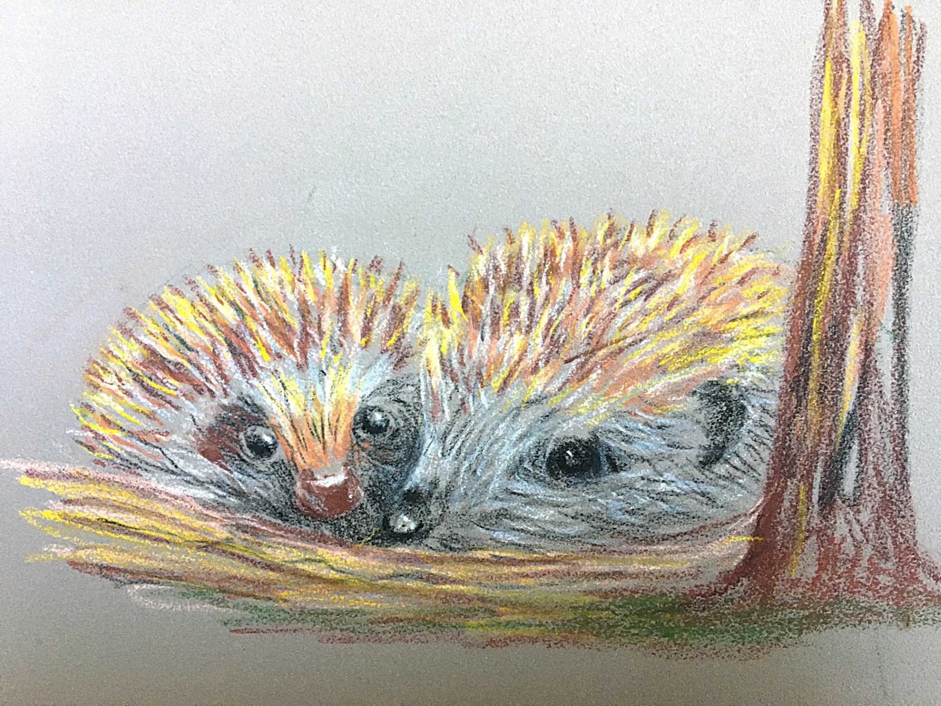 Colourful hedgehogs: pastel pencils on Pastelmat.  Rosalind.