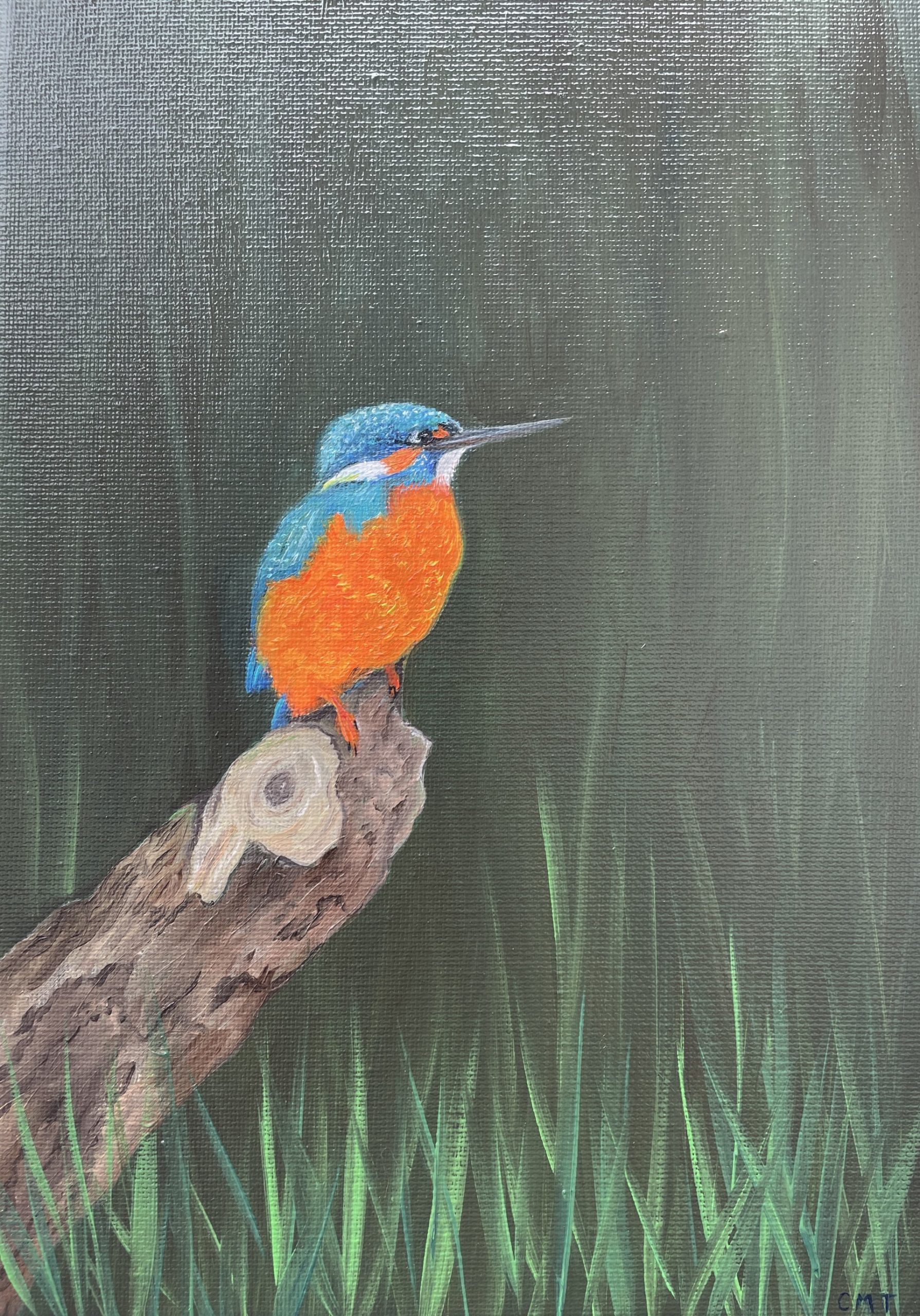 This is an oil painting of a kingfisher that I have done for this weekend’s challenge. I’ve tried to work faster than I usually do and to not get too bogged down with detail! I started it yesterday, and finished today, hence the sheen on the photo – wet paint!!
